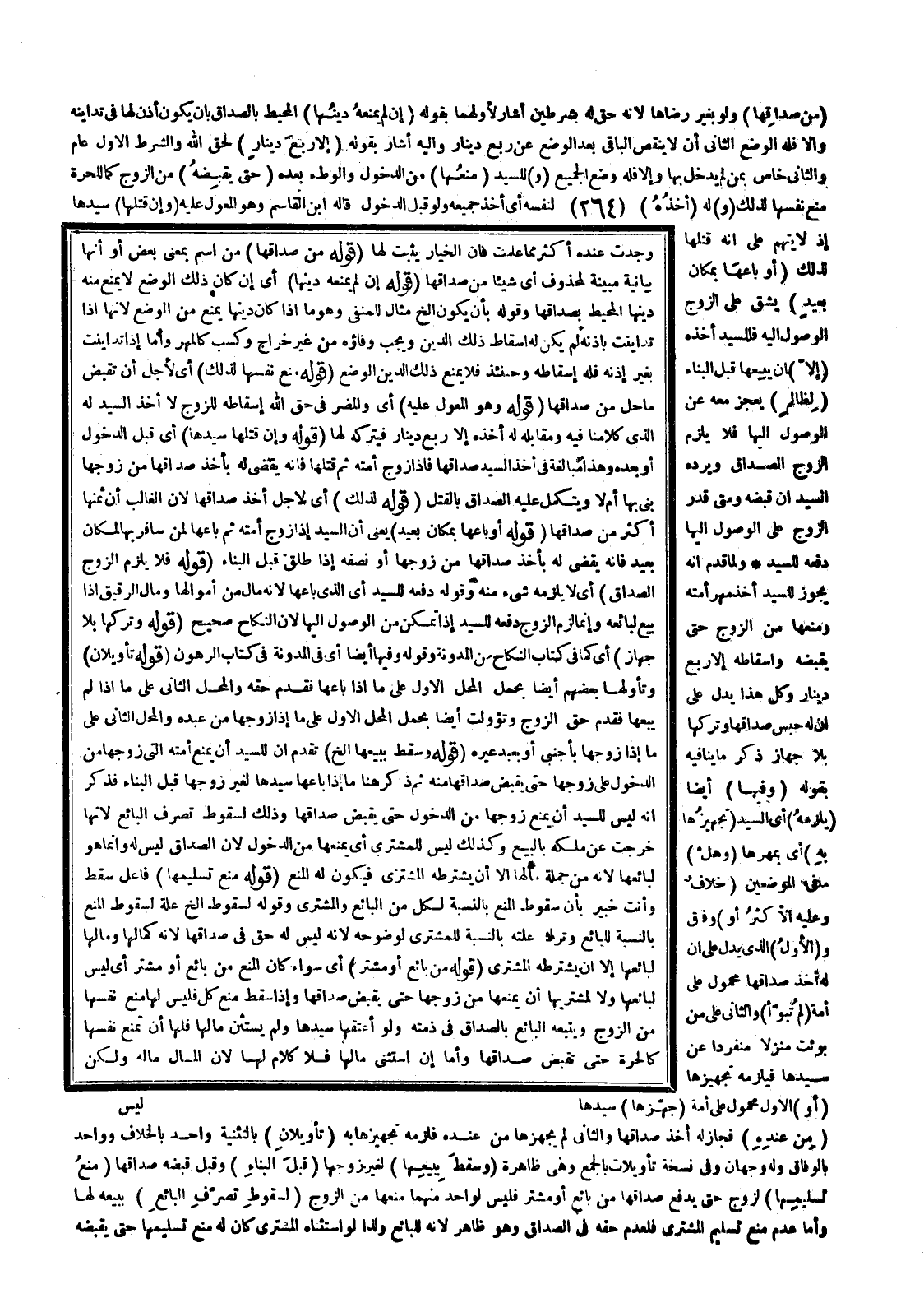 وَلَمَّا قَدَّمَ أَنَّهُ يَجُوزُ لِلسَّيِّدِ أَخْذُ مَهْرِ أَمَتِهِ وَمَنْعُهَا مِنْ الزَّوْجِ حَتَّى يَقْبِضَهُ وَإِسْقَاطُهُ إلَّا رُبْعَ دِينَارٍ وَكُلُّ هَذَا يَدُلُّ عَلَى أَنَّ لَهُ حَبْسَ صَدَاقِهَا وَتَرْكَهَا بِلَا جِهَازٍ ذُكِرَ مَا يُنَافِيهِ بِقَوْلِهِ (وَفِيهَا) أَيْضًا (يَلْزَمُهُ) أَيْ السَّيِّدَ (تَجْهِيزُهَا بِهِ) أَيْ بِمَهْرِهَا (وَهَلْ) مَا فِي الْمَوْضِعَيْنِ (خِلَافٌ وَعَلَيْهِ الْأَكْثَرُ أَوْ) وِفَاقٌ وَ (الْأَوَّلُ) الَّذِي يَدُلُّ عَلَى أَنَّ لَهُ أَخْذَ صَدَاقِهَا مَحْمُولٌ عَلَى أَمَةٍ (لَمْ تُبَوَّأْ) وَالثَّانِي عَلَى مَنْ بُوِّئَتْ مَنْزِلًا مُنْفَرِدًا عَنْ سَيِّدِهَا فَيَلْزَمُهُ تَجْهِيزُهَا (أَوْ) الْأَوَّلُ مَحْمُولٌ عَلَى أَمَةٍ (جَهَّزَهَا) سَيِّدُهَا (مِنْ عِنْدِهِ) فَجَازَ لَهُ أَخْذُ صَدَاقِهَا وَالثَّانِي لَمْ يُجَهِّزْهَا مِنْ عِنْدِهِ فَلَزِمَهُ تَجْهِيزُهَا بِهِ (تَأْوِيلَانِ) بِالتَّثْنِيَةِ وَاحِدٌ بِالْخِلَافِ وَوَاحِدٌ بِالْوِفَاقِ وَلَهُ وَجْهَانِ وَفِي نُسْخَةٍ تَأْوِيلَاتٌ بِالْجَمْعِ وَهِيَ ظَاهِرَةٌ (وَسَقَطَ بِبَيْعِهَا) لِغَيْرِ زَوْجِهَا.