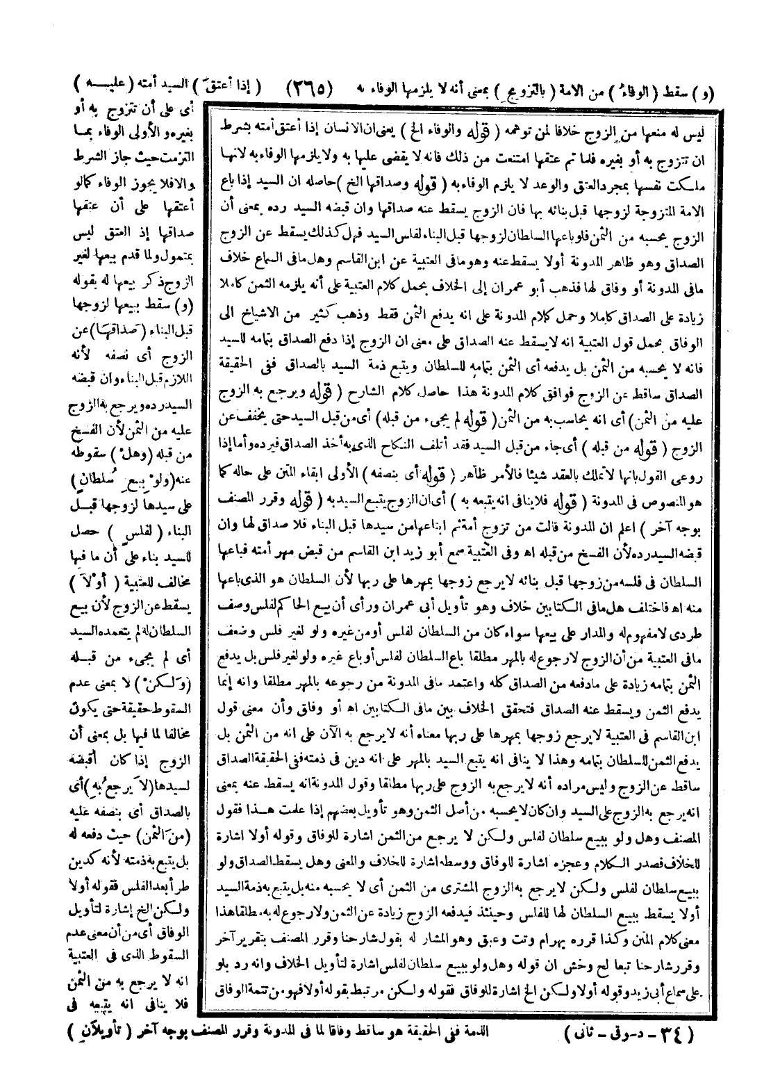 أَوْ وِفَاقٌ وَأَنَّ مَعْنَى قَوْلِ ابْنِ الْقَاسِمِ فِي الْعُتْبِيَّةِ لَا يَرْجِعُ زَوْجُهَا بِمَهْرِهَا عَلَى رَبِّهَا مَعْنَاهُ أَنَّهُ لَا يَرْجِعُ بِهِ الْآنَ عَلَى أَنَّهُ مِنْ الثَّمَنِ بَلْ يَدْفَعُ الثَّمَنَ لِلسُّلْطَانِ بِتَمَامِهِ وَهَذَا لَا يُنَافِي أَنَّهُ يَتْبَعُ السَّيِّدَ بِالْمَهْرِ عَلَى أَنَّهُ دَيْنٌ فِي ذِمَّتِهِ، فَفِي الْحَقِيقَةِ الصَّدَاقُ سَاقِطٌ عَنْ الزَّوْجِ وَلَيْسَ مُرَادُهُ أَنَّهُ لَا يَرْجِعُ بِهِ الزَّوْجُ عَلَى رَبِّهَا مُطْلَقًا، وَقَوْلُ الْمُدَوَّنَةِ إنَّهُ يَسْقُطُ عَنْهُ، بِمَعْنَى أَنَّهُ يَرْجِعُ بِهِ الزَّوْجُ عَلَى السَّيِّدِ، وَإِنْ كَانَ لَا يَحْسُبُهُ مِنْ أَصْلِ الثَّمَنِ وَهُوَ تَأْوِيلُ بَعْضِهِمْ إذَا عَلِمْت هَذَا فَقَوْلُ الْمُصَنِّفِ وَهَلْ وَلَوْ بِبَيْعِ سُلْطَانٍ لِفَلَسٍ وَلَكِنْ لَا يَرْجِعُ مِنْ الثَّمَنِ إشَارَةً لِلْوِفَاقِ وَقَوْلُهُ: أَوْ لَا إشَارَةً لِلْخِلَافِ فَصَدْرُ الْكَلَامِ وَعَجُزُهُ إشَارَةٌ لِلْوِفَاقِ وَوَسَطُهُ إشَارَةٌ لِلْخِلَافِ وَالْمَعْنَى وَهَلْ يَسْقُطُ الصَّدَاقُ، وَلَوْ بِبَيْعِ سُلْطَانٍ لِفَلَسٍ وَلَكِنْ لَا يَرْجِعُ بِهِ الزَّوْجُ الْمُشْتَرِي مِنْ الثَّمَنِ أَيْ لَا يَحْسُبُهُ مِنْهُ بَلْ يَتْبَعُ بِهِ ذِمَّةَ السَّيِّدِ أَوْ لَا يَسْقُطُ بِبَيْعِ السُّلْطَانِ لَهَا لِلْفَلَسِ وَحِينَئِذٍ فَيَدْفَعُهُ الزَّوْجُ زِيَادَةً عَنْ الثَّمَنِ وَلَا رُجُوعَ لَهُ بِهِ مُطْلَقًا هَذَا مَعْنَى كَلَامِ الْمَتْنِ، وَكَذَا قَرَّرَهُ بَهْرَامُ وتت وعبق وَهُوَ الْمُشَارُ لَهُ بِقَوْلِ شَارِحِنَا وَقَرَّرَ الْمُصَنِّفُ بِتَقْرِيرٍ آخَرَ، وَقَرَّرَ شَارِحُنَا تَبَعًا لح وخش أَنَّ قَوْلَهُ: وَهَلْ وَلَوْ بِبَيْعِ سُلْطَانٍ لِفَلَسٍ إشَارَةٌ لِتَأْوِيلِ الْخِلَافِ وَأَنَّهُ رُدَّ بِلَوْ عَلَى سَمَاعِ أَبِي زَيْدٍ وَقَوْلُهُ: أَوْ لَا وَلَكِنْ إلَخْ إشَارَةٌ لِلْوِفَاقِ فَقَوْلُهُ: وَلَكِنْ مُرْتَبِطٌ بِقَوْلِهِ أَوْ لَا فَهُوَ مِنْ تَتِمَّةِ الْوِفَاقِ