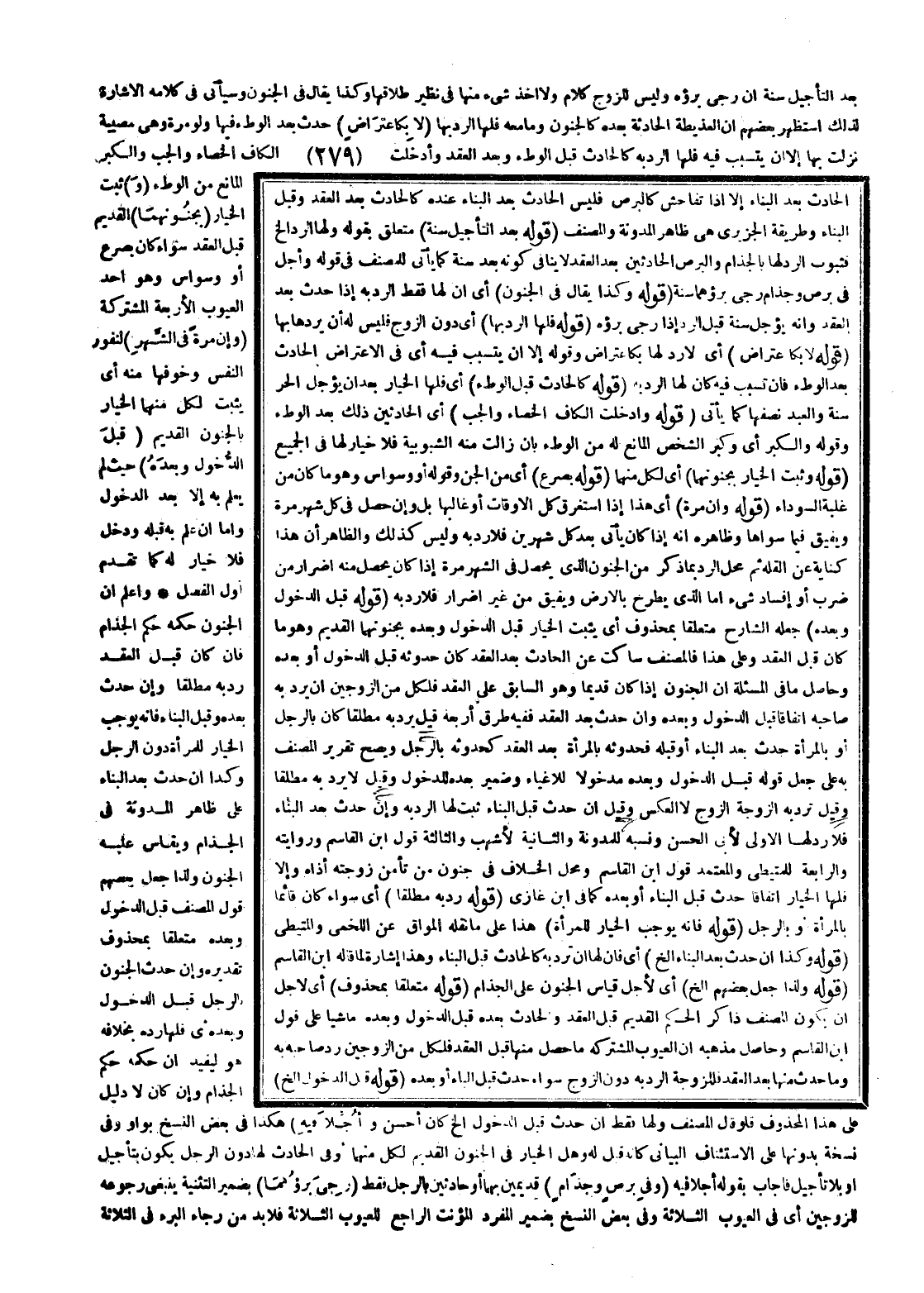 وَاعْلَمْ أَنَّ الْجُنُونَ حُكْمُهُ حُكْمُ الْجُذَامِ فَإِنْ كَانَ قَبْلَ الْعَقْدِ رُدَّ بِهِ مُطْلَقًا، وَإِنْ حَدَثَ بَعْدَهُ وَقَبْلَ الْبِنَاءِ فَإِنَّهُ يُوجِبُ الْخِيَارَ لِلْمَرْأَةِ دُونَ الرَّجُلِ، وَكَذَا إنْ حَدَثَ بَعْدَ الْبِنَاءِ عَلَى ظَاهِرِ الْمُدَوَّنَةِ فِي الْجُذَامِ وَيُقَاسُ عَلَيْهِ الْجُنُونُ وَلِذَا جَعَلَ بَعْضُهُمْ قَوْلَ الْمُصَنِّفِ قَبْلَ الدُّخُولِ وَبَعْدَهُ مُتَعَلِّقًا بِمَحْذُوفٍ تَقْدِيرُهُ، وَإِنْ حَدَثَ الْجُنُونُ بِالرَّجُلِ قَبْلَ الدُّخُولِ وَبَعْدَهُ أَيْ فَلَهَا رَدُّهُ بِخِلَافِهِ هُوَ لِيُفِيدَ أَنَّ حُكْمَهُ حُكْمُ الْجُذَامِ، وَإِنْ كَانَ لَا دَلِيلَ عَلَى هَذَا الْمَحْذُوفِ، فَلَوْ قَالَ الْمُصَنِّفُ وَلَهَا فَقَطْ إنْ حَدَثَ قَبْلَ الدُّخُولِ إلَخْ كَانَ أَحْسَنَ وَ (أُجِّلَا فِيهِ) هَكَذَا فِي بَعْضِ النُّسَخِ بِوَاوٍ وَفِي نُسْخَةٍ بِدُونِهَا عَلَى الِاسْتِئْنَافِ الْبَيَانِيِّ كَأَنَّهُ قِيلَ لَهُ: وَهَلْ الْخِيَارُ فِي الْجُنُونِ الْقَدِيمِ لِكُلٍّ مِنْهُمَا أَوْ فِي الْحَادِثِ لَهَا دُونَ الرَّجُلِ يَكُونُ بِتَأْجِيلٍ أَوْ بِلَا تَأْجِيلٍ فَأَجَابَ بِقَوْلِهِ أُجِّلَا فِيهِ.