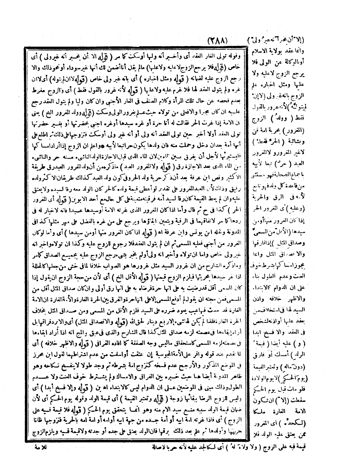 (قَوْلُهُ: إذَا كَانَ الْغُرُورُ مِنْهَا أَوْ مِنْ سَيِّدِهَا) أَيْ وَأَمَّا لَوْ كَانَ الْغُرُورُ مِنْ أَجْنَبِيٍّ فَعَلَيْهِ الْمُسَمَّى، ثُمَّ إنْ لَمْ يَتَوَلَّ الْعَقْدَ فَلَا رُجُوعَ لِلزَّوْجِ عَلَيْهِ، وَكَذَا إنْ تَوَلَّاهُ وَأَخْبَرَ أَنَّهُ غَيْرُ وَلِيٍّ خَاصٍّ، وَأَمَّا إنْ تَوَلَّاهُ وَأَخْبَرَ أَنَّهُ وَلِيٌّ أَوْ لَمْ يُخْبِرْ بِشَيْءٍ رَجَعَ الزَّوْجُ عَلَيْهِ بِجَمِيعِ الصَّدَاقِ كَمَا مَرَّ وَمَا ذَكَرَهُ الشَّارِحُ مِنْ أَنَّ غُرُورَ السَّيِّدِ مِثْلُ غُرُورِهَا وَهُوَ الصَّوَابُ خِلَافًا لِمَا فِي خش مِنْ جَعْلِهَا كَالْمُحَلَّلَةِ إذَا غَرَّ سَيِّدُهَا بِحُرِّيَّتِهَا فَيَلْزَمُ الزَّوْجَ قِيمَتُهَا.