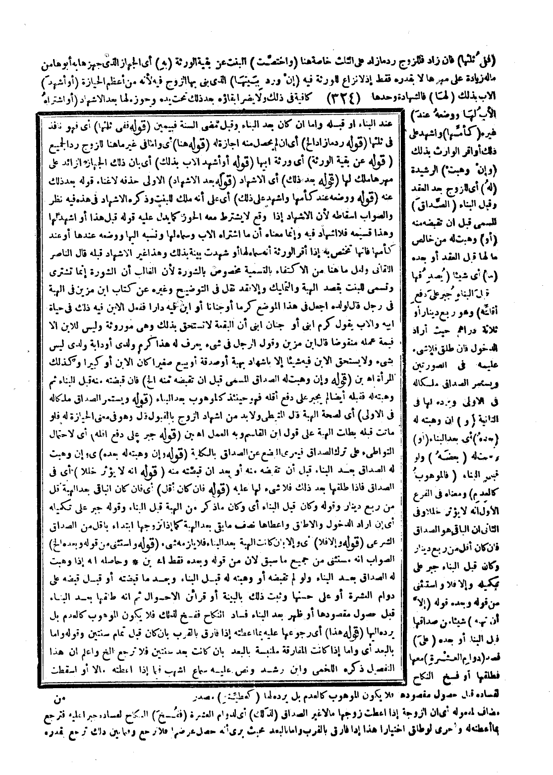 (وَإِنْ) (وَهَبَتْ) الرَّشِيدَةُ (لَهُ) أَيْ لِلزَّوْجِ بَعْدَ الْعَقْدِ وَقَبْلَ الْبِنَاءِ (الصَّدَاقَ) الْمُسَمَّى قَبْلَ أَنْ تَقْبِضَهُ مِنْهُ (أَوْ) وَهَبَتْ لَهُ مِنْ خَالِصِ مَالِهَا قَبْلَ الْعَقْدِ أَوْ بَعْدَهُ (مَا) أَيْ شَيْئًا (يَصْدُقُهَا بِهِ قَبْلَ الْبِنَاءِ جُبِرَ عَلَى دَفْعِ أَقَلِّهِ) وَهُوَ رُبْعُ دِينَارٍ أَوْ ثَلَاثَةُ دَرَاهِمَ حَيْثُ أَرَادَ الدُّخُولَ فَإِنْ طَلَّقَ فَلَا شَيْءَ عَلَيْهِ فِي الصُّورَتَيْنِ وَيَسْتَمِرُّ الصَّدَاقُ مِلْكًا لَهُ فِي الْأُولَى وَيَرُدُّهُ لَهَا فِي الثَّانِيَةِ (وَ) إنْ وَهَبَتْهُ لَهُ (بَعْدَهُ) أَيْ بَعْدَ الْبِنَاءِ (أَوْ) وَهَبَتْ لَهُ (بَعْضَهُ) ، وَلَوْ قَبْلَ الْبِنَاءِ (فَالْمَوْهُوبُ كَالْعَدَمِ) وَمَعْنَاهُ فِي الْفَرْعِ الْأَوَّلِ أَنَّهُ لَا يُؤَثِّرُ خَلَلًا وَفِي الثَّانِي أَنَّ الْبَاقِيَ هُوَ الصَّدَاقُ فَإِنْ كَانَ أَقَلَّ مِنْ رُبْعِ دِينَارٍ وَكَانَ قَبْلَ الْبِنَاءِ جُبِرَ عَلَى تَكْمِيلِهِ وَإِلَّا فَلَا وَاسْتَثْنَى مِنْ قَوْلِهِ وَبَعْدَهُ قَوْلَهُ (إلَّا أَنْ تَهَبَهُ) شَيْئًا مِنْ صَدَاقِهَا قَبْلَ الْبِنَاءِ أَوْ بَعْدَهُ (عَلَى) قَصْدِ (دَوَامِ الْعِشْرَةِ) مَعَهَا فَطَلَّقَهَا أَوْ فَسَخَ النِّكَاحَ لِفَسَادِهِ قَبْلَ حُصُولِ مَقْصُودِهَا فَلَا يَكُونُ الْمَوْهُوبُ كَالْعَدَمِ بَلْ يَرُدُّهُ لَهَا (كَعَطِيَّتِهِ) مَصْدَرٌ مُضَافٌ لِمَفْعُولِهِ أَيْ أَنَّ الزَّوْجَةَ إذَا أَعْطَتْ زَوْجَهَا مَالًا غَيْرَ الصَّدَاقِ (لِذَلِكَ) أَيْ لِدَوَامِ الْعِشْرَةِ (فَفُسِخَ) النِّكَاحُ لِفَسَادِهِ جَبْرًا عَلَيْهِ فَتَرْجِعُ بِمَا أَعْطَتْهُ لَهُ وَأَحْرَى لَوْ طَلَّقَ اخْتِيَارًا هَذَا إذَا فَارَقَ بِالْقُرْبِ، وَأَمَّا بِالْبُعْدِ بِحَيْثُ يَرَى أَنَّهُ حَصَلَ غَرَضُهَا فَلَا تَرْجِعُ وَفِيمَا بَيْنَ ذَلِكَ تَرْجِعُ بِقَدْرِهِ