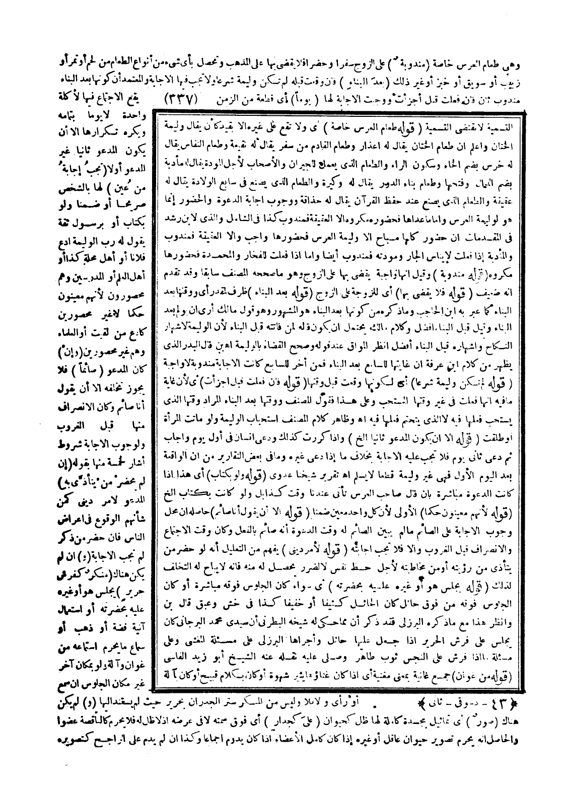 وَهِيَ طَعَامُ الْعُرْسِ خَاصَّةً (مَنْدُوبَةٌ) عَلَى الزَّوْجِ سَفَرًا وَحَضَرًا فَلَا يُقْضَى بِهَا عَلَى الْمَذْهَبِ وَتَحْصُلُ بِأَيِّ شَيْءٍ مِنْ أَنْوَاعِ الطَّعَامِ مِنْ لَحْمٍ أَوْ تَمْرٍ أَوْ زَبِيبٍ أَوْ سَوِيقٍ أَوْ خُبْزٍ أَوْ غَيْرِ ذَلِكَ (بَعْدَ الْبِنَاءِ) فَإِنْ وَقَعَتْ قَبْلَهُ لَمْ تَكُنْ وَلِيمَةً شَرْعًا وَلَا تَجِبُ فِيهَا الْإِجَابَةُ والْمُعْتَمَدُ أَنَّ كَوْنَهَا بَعْدَ الْبِنَاءِ مَنْدُوبٌ ثَانٍ فَإِنْ فُعِلَتْ قَبْلُ أَجْزَأَتْ وَوَجَبَتْ الْإِجَابَةُ لَهَا (يَوْمًا) أَيْ قِطْعَةً مِنْ الزَّمَنِ يَقَعُ الِاجْتِمَاعُ فِيهَا لِأَكْلَةٍ وَاحِدَةٍ لَا يَوْمًا بِتَمَامِهِ وَيُكْرَهُ تَكْرَارُهَا إلَّا أَنْ يَكُونَ الْمَدْعُوُّ ثَانِيًا غَيْرَ الْمَدْعُوِّ أَوَّلًا (تَجِبُ إجَابَةُ مَنْ عُيِّنَ) لَهَا بِالشَّخْصِ صَرِيحًا أَوْ ضِمْنًا وَلَوْ بِكِتَابٍ أَوْ بِرَسُولٍ ثِقَةٍ يَقُولُ لَهُ رَبُّ الْوَلِيمَةِ اُدْعُ فُلَانًا أَوْ أَهْلَ مَحَلَّةِ كَذَا أَوْ أَهْلَ الْعِلْمِ أَوْ الْمُدَرِّسِينَ وَهُمْ مَحْصُورُونَ لِأَنَّهُمْ مُعَيَّنُونَ حُكْمًا لَا غَيْرُ مَحْصُورِينَ كَادْعُ مَنْ لَقِيت أَوْ الْعُلَمَاءَ وَهُمْ غَيْرُ مَحْصُورِينَ.