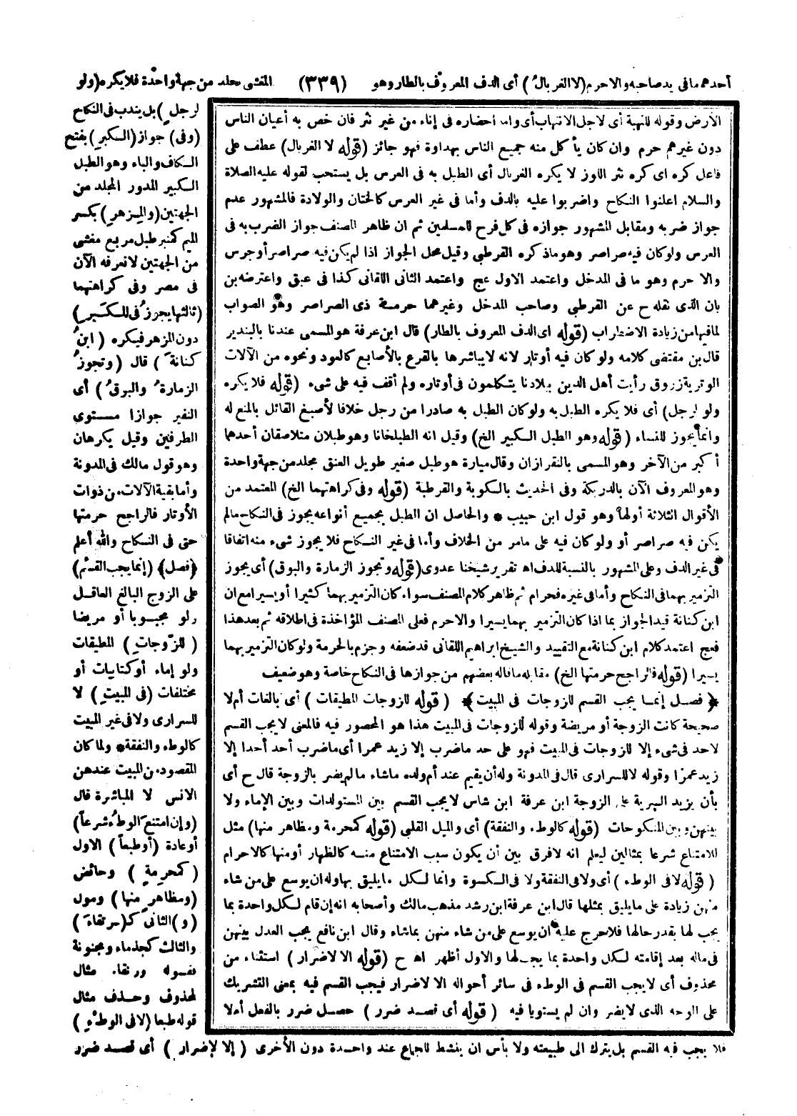 (وَفِي) جَوَازِ (الْكَبَرِ) بِفَتْحِ الْكَافِ وَالْبَاءِ وَهُوَ الطَّبْلُ الْكَبِيرُ الْمُدَوَّرُ الْمُجَلَّدُ مِنْ الْجِهَتَيْنِ (وَالْمِزْهَرِ) بِكَسْرِ الْمِيمِ كَمِنْبَرِ طَبْلٌ مُرَبَّعٌ مُغَشًّى مِنْ الْجِهَتَيْنِ لَا نَعْرِفُهُ الْآنَ فِي مِصْرَ وَفِي كَرَاهَتِهِمَا (ثَالِثُهَا) (يَجُوزُ فِي الْكَبِيرُ) دُونَ الْمِزْهَرِ فَيُكْرَهُ (ابْنُ كِنَانَةَ) قَالَ (وَتَجُوزُ الزَّمَّارَةُ وَالْبُوقُ) أَيْ النَّفِيرُ جَوَازًا مُسْتَوِيَ الطَّرَفَيْنِ وَقِيلَ يُكْرَهَانِ وَهُوَ قَوْلُ مَالِكٍ فِي الْمُدَوَّنَةِ وَأَمَّا بَقِيَّةُ الْآلَاتِ مِنْ ذَوَاتِ الْأَوْتَارِ فَالرَّاجِحُ حُرْمَتُهَا حَتَّى فِي النِّكَاحِ وَاَللَّهُ أَعْلَمُ.