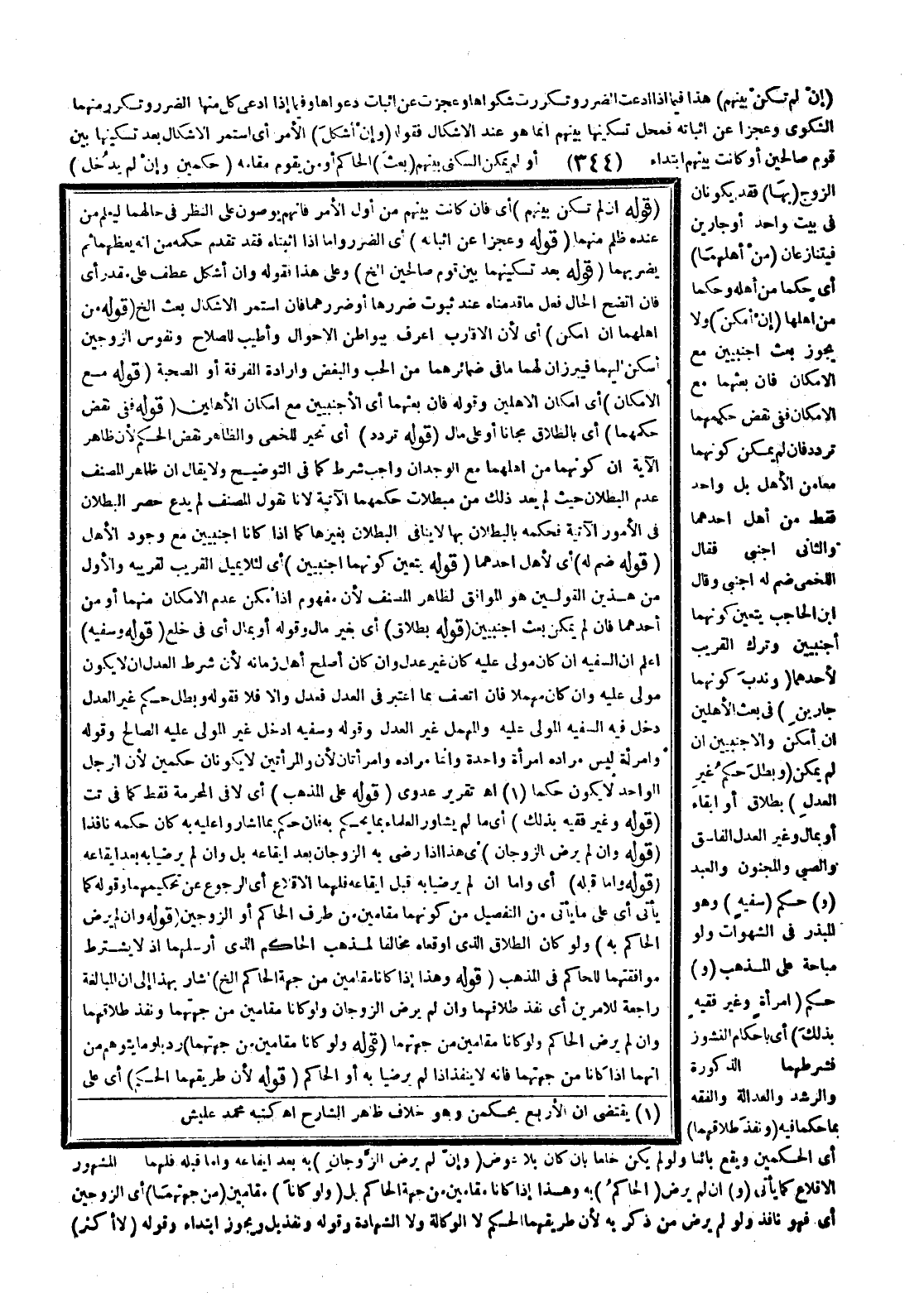 فَقَوْلُهُ (وَإِنْ) (أَشْكَلَ) الْأَمْرُ أَيْ اسْتَمَرَّ الْإِشْكَالُ بَعْدَ تَسْكِينِهَا بَيْنَ قَوْمٍ صَالِحِينَ أَوْ كَانَتْ بَيْنَهُمْ ابْتِدَاءً أَوْ لَمْ يُمْكِنْ السُّكْنَى بَيْنَهُمْ (بَعَثَ) الْحَاكِمُ أَوْ مَنْ يَقُومُ مَقَامَهُ (حَكَمَيْنِ وَإِنْ لَمْ يَدْخُلْ) الزَّوْجُ (بِهَا) فَقَدْ يَكُونَانِ فِي بَيْتٍ وَاحِدٍ أَوْ جَارَيْنِ فَيَتَنَازَعَانِ (مِنْ أَهْلِهِمَا) أَيْ حَكَمًا مِنْ أَهْلِهِ وَحَكَمًا مِنْ أَهْلِهَا (إنْ أَمْكَنَ) وَلَا يَجُوزُ بَعْثُ أَجْنَبِيَّيْنِ مَعَ الْإِمْكَانِ فَإِنْ بَعَثَهُمَا مَعَ الْإِمْكَانِ فَفِي نَقْضِ حُكْمِهِمَا تَرَدُّدٌ فَإِنْ لَمْ يُمْكِنْ كَوْنُهُمَا مَعًا مِنْ الْأَهْلِ بَلْ وَاحِدٌ فَقَطْ مِنْ أَهْلِ أَحَدِهِمَا وَالثَّانِي أَجْنَبِيٌّ فَقَالَ اللَّخْمِيُّ ضُمَّ لَهُ أَجْنَبِيٌّ وَقَالَ ابْنُ الْحَاجِبِ يَتَعَيَّنُ كَوْنُهُمَا أَجْنَبِيَّيْنِ وَتَرْكُ الْقَرِيبِ لِأَحَدِهِمَا (وَنُدِبَ كَوْنُهُمَا جَارَيْنِ) فِي بَعْثِ الْأَهْلَيْنِ إنْ أَمْكَنَ وَالْأَجْنَبِيَّيْنِ إنْ لَمْ يُمْكِنْ.