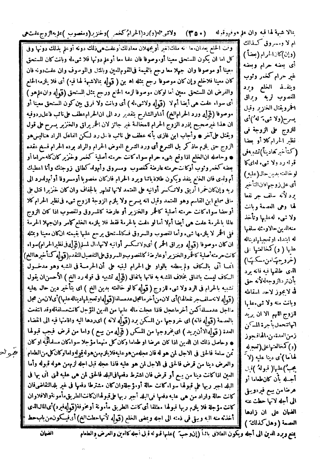 (و) رُدَّ (الْحَرَامُ كَخَمْرٍ) وَخِنْزِيرٍ (وَمَغْصُوبٍ) عَلِمَ بِهِ الزَّوْجُ عَلِمَتْ هِيَ أَمْ لَا وَمَسْرُوقٍ كَذَلِكَ (وَإِنْ) كَانَ الْحَرَامُ (بَعْضًا) أَيْ بَعْضُهُ حَرَامٌ وَبَعْضُهُ غَيْرُ حَرَامٍ كَخَمْرٍ وَثَوْبٍ وَيَنْفُذُ الْخُلْعُ وَيُرَدُّ الْمَغْصُوبُ لِرَبِّهِ وَيُرَاقُ الْخَمْرُ وَيُقْتَلُ الْخِنْزِيرُ وَقِيلَ يُسَرَّحُ (وَلَا شَيْءَ لَهُ) أَيْ لِلزَّوْجِ عَلَى الزَّوْجَةِ فِي نَظِيرِ الْحَرَامِ كُلًّا أَوْ بَعْضًا (كَتَأْخِيرِهَا دَيْنًا) تَشْبِيهٌ فِي قَوْلِهِ رُدَّ وَلَا شَيْءَ لَهُ أَيْ كَمَا لَوْ خَالَعَتْهُ بِدَيْنٍ حَالٍّ (عَلَيْهِ) أَيْ عَلَى زَوْجِهَا فَإِنَّ التَّأْخِيرَ يُرَدُّ لِأَنَّهُ سَلَفٌ جَرَّ نَفْعًا لَهَا وَهِيَ الْعِصْمَةُ وَبَانَتْ وَلَا شَيْءَ لَهُ عَلَيْهَا وَتَأْخُذُ مِنْهُ الدَّيْنَ حَالًّا وَمِثْلُهُ سَلَفُهَا لَهُ ابْتِدَاءً أَوْ تَعْجِيلُهَا دَيْنًا لَهُ عَلَيْهَا (و) كَمُخَالَعَتِهَا عَلَى (خُرُوجِهَا مِنْ مَسْكَنِهَا) الَّذِي طَلَّقَهَا فِيهِ فَإِنَّهُ يُرَدُّ بِأَنْ تَرُدَّ الزَّوْجَةُ لَهُ لِأَنَّهُ حَقٌّ لِلَّهِ لَا يَجُوزُ لِأَحَدٍ إسْقَاطُهُ وَبَانَتْ مِنْهُ وَلَا شَيْءَ عَلَيْهَا لِلزَّوْجِ اللَّهُمَّ إلَّا أَنْ يُرِيدَ أَنَّهَا تَتَحَمَّلُ بِأُجْرَةِ الْمَسْكَنِ زَمَنَ الْعِدَّةِ مِنْ مَالِهَا فَيَجُوزُ (و) كَمُخَالَعَتِهَا عَلَى (تَعْجِيلِهِ لَهَا مَا) أَيْ دَيْنًا عَلَيْهِ (لَا يَجِبُ) عَلَيْهَا (قَبُولُهُ) قَبْلَ أَجَلِهِ بِأَنْ كَانَ طَعَامًا أَوْ عَرْضًا مِنْ بَيْعٍ فَيُرَدُّ وَيَبْقَى إلَى أَجَلِهِ لِأَنَّهَا حَطَّتْ عَنْهُ الضَّمَانَ عَلَى أَنْ زَادَهَا الْعِصْمَةَ (وَهَلْ كَذَلِكَ) يَمْنَعُ وَيَرُدُّ الدَّيْنَ إلَى أَجَلِهِ وَيَكُونُ الطَّلَاقُ بَائِنًا (إنْ وَجَبَ) عَلَيْهَا قَبُولُهُ قَبْلَ أَجَلِهِ كَالْعَيْنِ وَالْعَرْضِ وَالطَّعَامِ