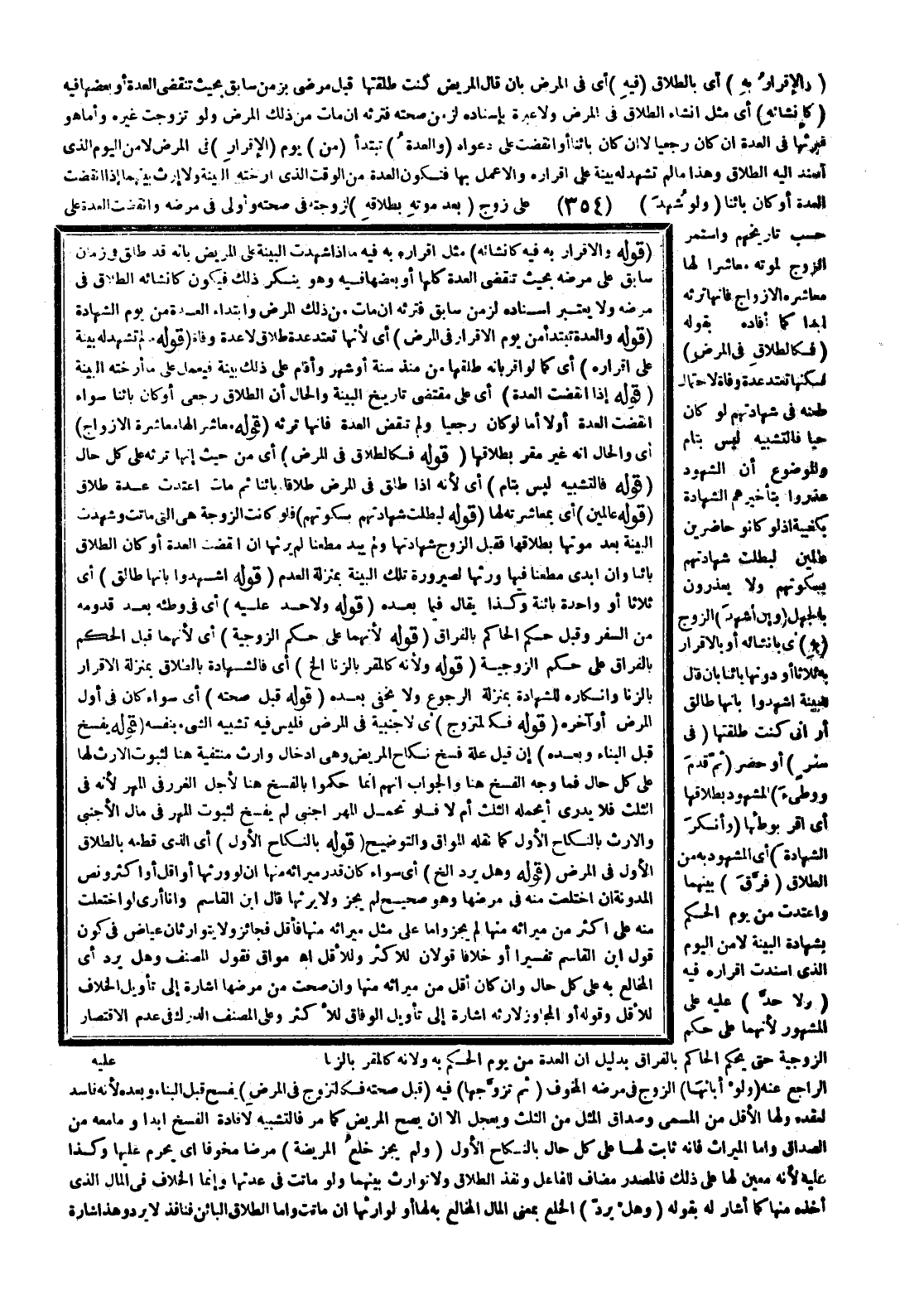 ـــــــــــــــــــــــــــــQقَوْلُهُ وَالْإِقْرَارُ بِهِ فِيهِ كَإِنْشَائِهِ) مِثْلُ إقْرَارِهِ بِهِ فِيهِ مَا إذَا شَهِدَتْ الْبَيِّنَةُ عَلَى الْمَرِيضِ بِأَنَّهُ قَدْ طَلَّقَ فِي زَمَانٍ سَابِقٍ عَلَى مَرَضِهِ بِحَيْثُ تَنْقَضِي الْعِدَّةُ كُلُّهَا أَوْ بَعْضُهَا فِيهِ وَهُوَ يُنْكِرُ ذَلِكَ فَيَكُونُ كَإِنْشَائِهِ الطَّلَاقَ فِي مَرَضِهِ وَلَا يُعْتَبَرُ إسْنَادُهُ لِزَمَنٍ سَابِقٍ فَتَرِثُهُ إنْ مَاتَ مِنْ ذَلِكَ الْمَرَضِ وَابْتِدَاءُ الْعِدَّةِ مِنْ يَوْمِ الشَّهَادَةِ (قَوْلُهُ وَالْعِدَّةُ تُبْتَدَأُ مِنْ يَوْمِ الْإِقْرَارِ فِي الْمَرَضِ) أَيْ لِأَنَّهَا تَعْتَدُّ عِدَّةَ طَلَاقٍ لَا عِدَّةَ وَفَاةٍ. (قَوْلُهُ مَا لَمْ تَشْهَدْ لَهُ بَيِّنَةٌ عَلَى إقْرَارِهِ) أَيْ كَمَا لَوْ أَقَرَّ بِأَنَّهُ طَلَّقَهَا مِنْ مُنْذُ سَنَةٍ أَوْ شَهْرٍ وَأَقَامَ عَلَى ذَلِكَ بَيِّنَةً فَيَعْمَلُ عَلَى مَا أَرَّخَتْهُ الْبَيِّنَةُ (قَوْلُهُ إذَا انْقَضَتْ الْعِدَّةُ) أَيْ عَلَى مُقْتَضَى تَارِيخِ الْبَيِّنَةِ وَالْحَالُ أَنَّ الطَّلَاقَ رَجْعِيٌّ أَوْ كَانَ بَائِنًا سَوَاءٌ انْقَضَتْ الْعِدَّةُ أَوْ لَا أَمَّا لَوْ كَانَ رَجْعِيًّا وَلَمْ تَنْقَضِ الْعِدَّةُ فَإِنَّهَا تَرِثُهُ