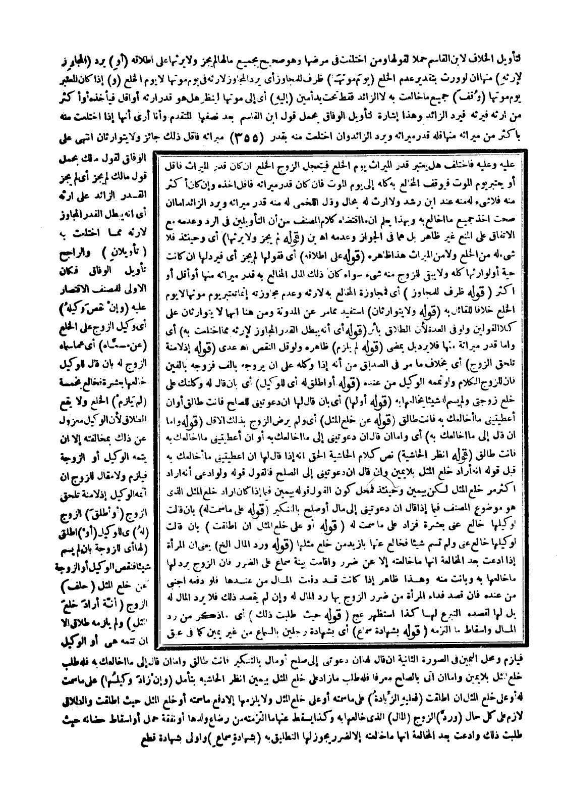 لِتَأْوِيلِ الْخِلَافِ لِابْنِ الْقَاسِمِ حَمْلًا لِقَوْلِهَا وَمَنْ اخْتَلَعَتْ فِي مَرَضِهَا وَهُوَ صَحِيحٌ بِجَمِيعِ مَالِهَا لَمْ يَجُزْ وَلَا يَرِثُهَا عَلَى إطْلَاقِهِ (أَوْ) يَرُدُّ (الْمُجَاوِزُ لِإِرْثِهِ) مِنْهَا أَنْ لَوْ وَرِثَ بِتَقْدِيرِ عَدَمِ الْخُلْعِ (يَوْمَ مَوْتِهَا) ظَرْفٌ لِلْمُجَاوِزِ أَيْ يَرُدُّ الْمُجَاوِزُ لِإِرْثِهِ فِي يَوْمِ مَوْتِهَا لَا يَوْمِ الْخُلْعِ (و) إذَا كَانَ الْمُعْتَبَرُ يَوْمَ مَوْتِهَا (وَقَفَ) جَمِيعَ مَا خَالَعَتْ بِهِ لَا الزَّائِدَ فَقَطْ تَحْتَ يَدِ أَمِينٍ (إلَيْهِ) أَيْ إلَى مَوْتِهَا لِيَنْظُرَ هَلْ هُوَ قَدْرُ إرْثِهِ أَوْ أَقَلُّ فَيَأْخُذُهُ أَوْ أَكْثَرُ مِنْ إرْثِهِ فَيَرِثُهُ فَيَرُدُّ الزَّائِدَ وَهَذَا إشَارَةٌ لِتَأْوِيلِ الْوِفَاقِ بِحَمْلِ قَوْلِ ابْنِ الْقَاسِمِ بَعْدَ نِصْفِهَا الْمُتَقَدِّمِ وَأَنَا أَرَى أَنَّهَا إذَا اخْتَلَعَتْ مِنْهُ بِأَكْثَرَ مِنْ مِيرَاثِهِ مِنْهَا فَلَهُ قَدْرُ مِيرَاثِهِ وَيَرُدُّ الزَّائِدَ وَإِنْ اخْتَلَعَتْ مِنْهُ بِقَدْرِ مِيرَاثِهِ فَأَقَلَّ ذَلِكَ جَائِزٌ وَلَا يَتَوَارَثَانِ انْتَهَى عَلَى الْوِفَاقِ لِقَوْلِ مَالِكٍ بِحَمْلِ قَوْلِ مَالِكٍ لَمْ يَجُزْ أَيْ لَمْ يَجُزْ الْقَدْرُ الزَّائِدُ عَلَى إرْثِهِ أَيْ أَنَّهُ يَبْطُلُ الْقَدْرُ الْمُجَاوِزُ لِإِرْثِهِ مِمَّا اخْتَلَعَتْ بِهِ (تَأْوِيلَانِ) وَالرَّاجِحُ تَأْوِيلُ الْوِفَاقِ فَكَانَ الْأَوْلَى لِلْمُصَنِّفِ الِاقْتِصَارَ عَلَيْهِ.