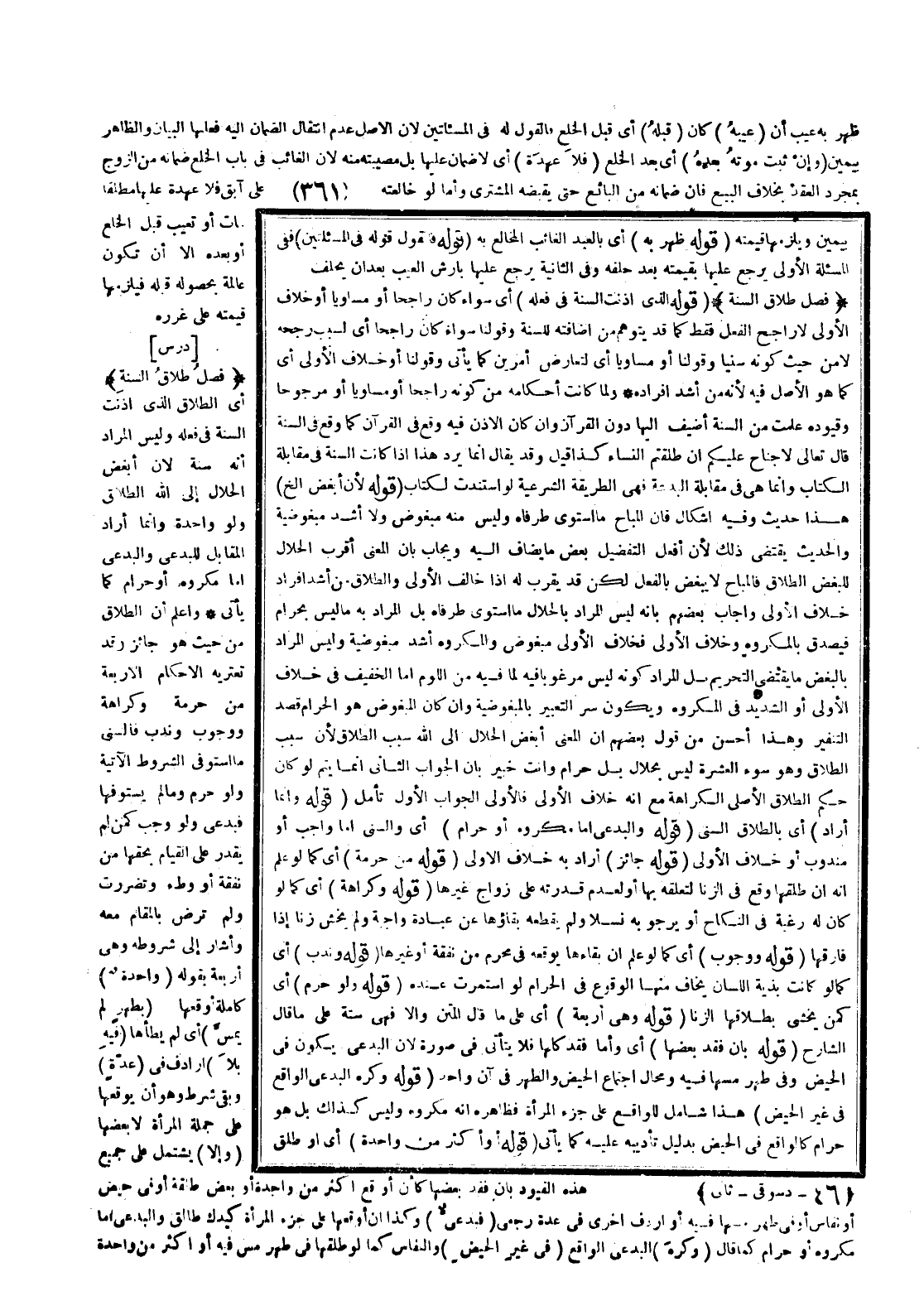 (قَوْلُهُ وَإِنَّمَا أَرَادَ) أَيْ بِالطَّلَاقِ السُّنِّيَّ (قَوْلُهُ وَالْبِدْعِيُّ إمَّا مَكْرُوهٌ أَوْ حَرَامٌ) أَيْ وَالسُّنِّيُّ إمَّا وَاجِبٌ أَوْ مَنْدُوبٌ أَوْ خِلَافُ الْأَوْلَى (قَوْلُهُ جَائِزٌ) أَرَادَ بِهِ خِلَافَ الْأَوْلَى (قَوْلُهُ مِنْ حُرْمَةٍ) أَيْ كَمَا لَوْ عَلِمَ أَنَّهُ إنْ طَلَّقَهَا وَقَعَ فِي الزِّنَا لِتَعَلُّقِهِ بِهَا أَوْ لِعَدَمِ قُدْرَتِهِ عَلَى زَوَاجِ غَيْرِهَا (قَوْلُهُ وَكَرَاهَةٍ) أَيْ كَمَا لَوْ كَانَ لَهُ رَغْبَةٌ فِي النِّكَاحِ أَوْ يَرْجُو بِهِ نَسْلًا وَلَمْ يَقْطَعْهُ بَقَاؤُهَا عَنْ عِبَادَةٍ وَاجِبَةٍ وَلَمْ يَخْشَ زِنًا إذَا فَارَقَهَا (قَوْلُهُ وَوُجُوبٍ) أَيْ كَمَا لَوْ عَلِمَ أَنَّ بَقَاءَهَا يُوقِعُهُ فِي مُحَرَّمٍ مِنْ نَفَقَةٍ أَوْ غَيْرِهَا (قَوْلُهُ وَنَدْبٍ) أَيْ كَمَا لَوْ كَانَتْ بَذِيَّةَ اللِّسَانِ يَخَافُ مِنْهَا الْوُقُوعَ فِي الْحَرَامِ لَوْ اسْتَمَرَّتْ عِنْدَهُ (قَوْلُهُ وَلَوْ حَرُمَ) أَيْ كَمَنْ يَخْشَى بِطَلَاقِهَا الزِّنَا (قَوْلُهُ وَهِيَ أَرْبَعَةٌ) أَيْ عَلَى مَا قَالَ الْمَتْنُ وَإِلَّا فَهِيَ سِتَّةٌ عَلَى مَا قَالَ الشَّارِحُ (قَوْلُهُ بِأَنْ فَقَدَ بَعْضَهَا) أَيْ، وَأَمَّا فَقْدُ كُلِّهَا فَلَا يَتَأَتَّى فِي صُورَةٍ لِأَنَّ الْبِدْعِيَّ يَكُونُ فِي الْحَيْضِ وَفِي طُهْرٍ مَسَّهَا فِيهِ وَمُحَالٌ اجْتِمَاعُ الْحَيْضِ وَالطُّهْرِ فِي آنٍ وَاحِدٍ.