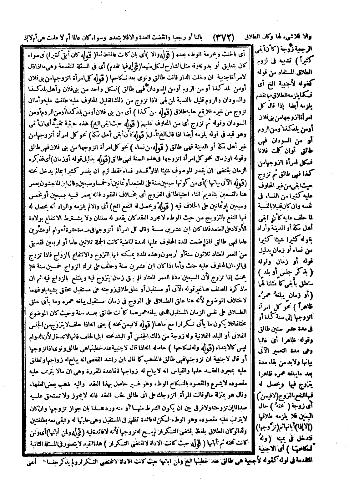 وَإِلَّا فَلَا شَيْءَ لَهَا وَكَانَ الطَّلَاقُ بَائِنًا أَوْ رَجْعِيًّا وَانْقَضَتْ الْعِدَّةُ وَإِلَّا فَلَا يَتَعَدَّدُ وَسَوَاءٌ كَانَ عَالِمًا أَمْ لَا عَلِمَتْ هِيَ أَمْ لَا إذْ الرَّجْعِيَّةُ زَوْجَةٌ (كَأَنْ أَبْقَى كَثِيرًا) تَشْبِيهٌ فِي لُزُومِ الطَّلَاقِ الْمُسْتَفَادِ مِنْ قَوْلِهِ كَقَوْلِهِ لِأَجْنَبِيَّةٍ إلَخْ أَيْ فَكَمَا يَلْزَمُهُ الطَّلَاقُ فِيمَا تَقَدَّمَ يَلْزَمُهُ أَيْضًا إذَا قَالَ: كُلُّ امْرَأَةٍ أَتَزَوَّجُهَا مِنْ بَنِي فُلَانٍ أَوْ مِنْ بَلَدِ كَذَا أَوْ مِنْ الرُّومِ أَوْ مِنْ السُّودَانِ فَهِيَ طَالِقٌ، أَوْ إنْ كَلَّمْت فُلَانًا فَكُلُّ امْرَأَةٍ أَتَزَوَّجُهَا مِنْ كَذَا فَهِيَ طَالِقٌ ثُمَّ تَزَوَّجَ حَيْثُ أَبْقَى مِنْ غَيْرِ الْمَحْلُوفِ عَلَيْهِ كَثِيرًا مِنْ النِّسَاءِ فِي نَفْسِهِ وَإِنْ كَانَ قَلِيلًا بِالنِّسْبَةِ لِمَا حَلَفَ عَلَيْهِ كَأَنْ أَبْقَى أَهْلَ مَكَّةَ أَوْ الْمَدِينَةِ وَأَرَادَ بِقَوْلِهِ كَثِيرًا شَيْئًا كَثِيرًا مِنْ نِسَاءٍ أَوْ زَمَانٍ بِدَلِيلِ قَوْلِهِ أَوْ زَمَانٍ وَقَوْلُهُ (بِذِكْرِ جِنْسٍ أَوْ بَلَدٍ) مُتَعَلِّقٌ بِأَبْقَى كَمَا مَثَّلْنَا لَهُمَا