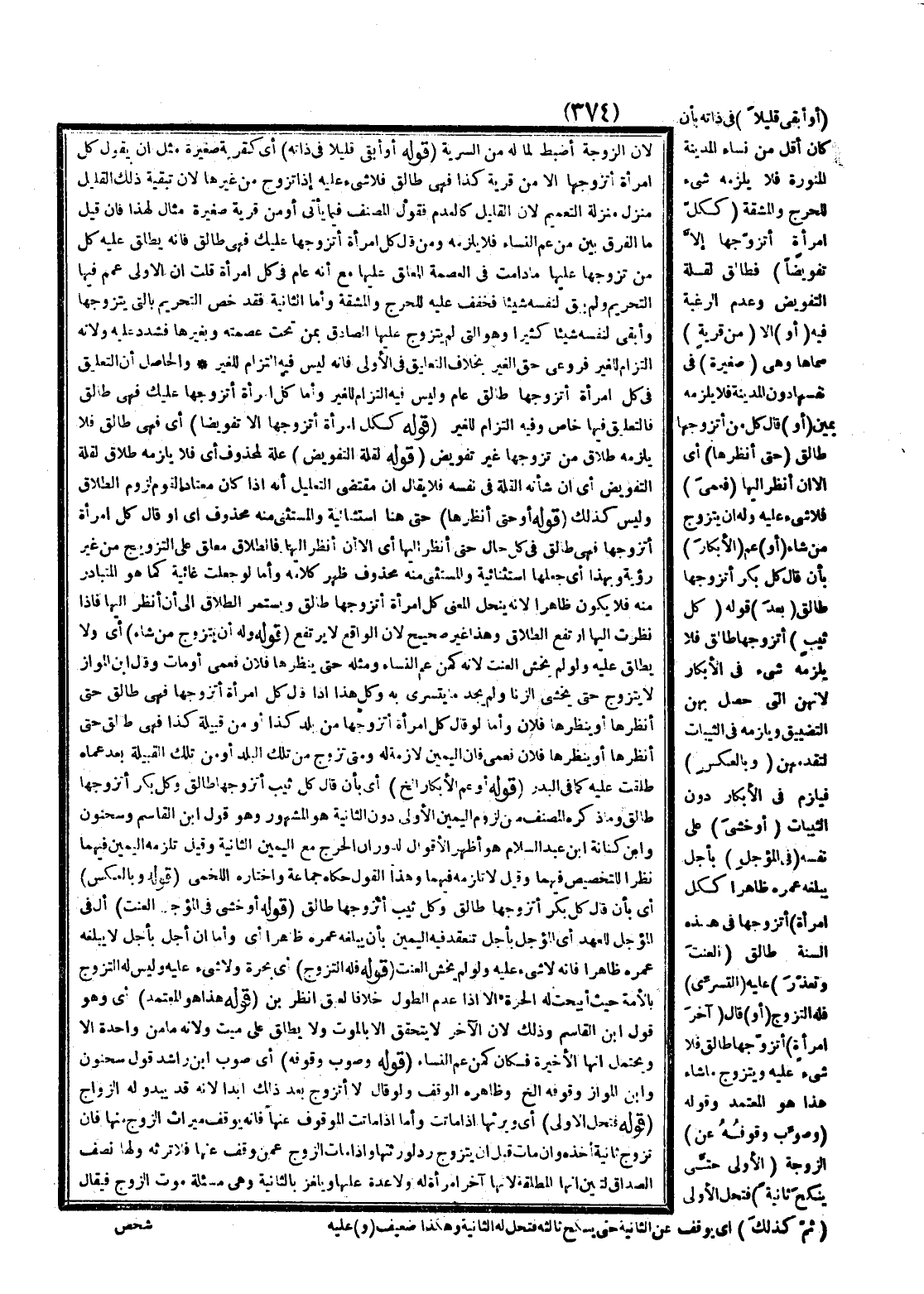 (أَوْ أَبْقَى قَلِيلًا) فِي ذَاتِهِ بِأَنْ كَانَ أَقَلَّ مِنْ نِسَاءِ الْمَدِينَةِ الْمُنَوَّرَةِ فَلَا يَلْزَمُهُ شَيْءٌ لِلْحَرَجِ وَالْمَشَقَّةِ (كَكُلُّ امْرَأَةٍ أَتَزَوَّجُهَا إلَّا تَفْوِيضًا) فَطَالِقٌ لِقِلَّةِ التَّفْوِيضِ وَعَدَمِ الرَّغْبَةِ فِيهِ (أَوْ) إلَّا (مِنْ قَرْيَةٍ) سَمَّاهَا وَهِيَ (صَغِيرَةٌ) فِي نَفْسِهَا دُونَ الْمَدِينَةِ فَلَا يَلْزَمُهُ يَمِينٌ (أَوْ) قَالَ كُلُّ مَنْ أَتَزَوَّجُهَا طَالِقٌ (حَتَّى أَنْظُرَهَا) أَيْ إلَّا أَنْ أَنْظُرَ إلَيْهَا (فَعَمِيَ) فَلَا شَيْءَ عَلَيْهِ وَلَهُ أَنْ يَتَزَوَّجَ مَنْ شَاءَ (أَوْ) عَمَّ (الْأَبْكَارَ) بِأَنْ قَالَ كُلُّ بِكْرٍ أَتَزَوَّجُهَا طَالِقٌ (بَعْدَ) قَوْلِهِ (كُلُّ ثَيِّبٍ) أَتَزَوَّجُهَا طَالِقٌ فَلَا يَلْزَمُهُ شَيْءٌ فِي الْأَبْكَارِ؛ لِأَنَّهُنَّ الَّتِي حَصَلَ بِهِنَّ التَّضْيِيقُ وَيَلْزَمُهُ فِي الثِّيَابِ لِتَقَدُّمِهِنَّ (وَبِالْعَكْسِ) فَيَلْزَمُهُ فِي الْأَبْكَارِ دُونَ الثِّيَابِ (أَوْ خَشِيَ) عَلَى نَفْسِهِ (فِي الْمُؤَجَّلِ) بِأَجَلٍ يَبْلُغُهُ عُمْرُهُ ظَاهِرًا كَكُلُّ (امْرَأَةٍ) أَتَزَوَّجُهَا فِي هَذِهِ السَّنَةِ طَالِقٌ (الْعَنَتَ وَتَعَذَّرَ) عَلَيْهِ (التَّسَرِّي) فَلَهُ التَّزَوُّجُ.