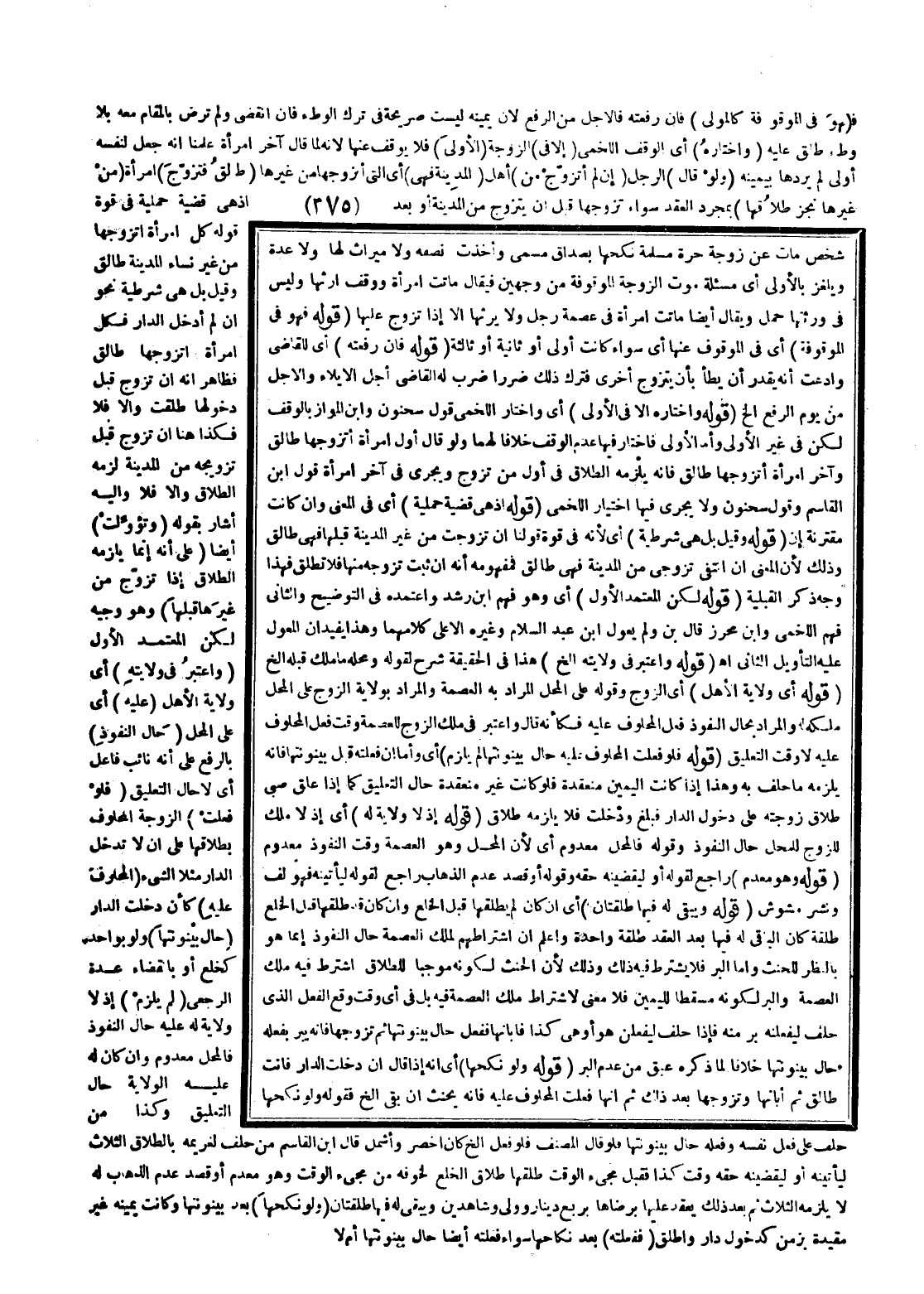 (وَاعْتُبِرَ فِي وِلَايَتِهِ) أَيْ وِلَايَةِ الْأَهْلِ (عَلَيْهِ) أَيْ عَلَى الْمَحَلِّ (حَالُ النُّفُوذِ) بِالرَّفْعِ عَلَى أَنَّهُ نَائِبُ فَاعِلٍ أَيْ لَا حَالُ التَّعْلِيقِ (فَلَوْ فَعَلَتْ) الزَّوْجَةُ الْمَحْلُوفُ بِطَلَاقِهَا عَلَى أَنْ لَا تَدْخُلَ الدَّارَ مَثَلًا الشَّيْءَ (الْمَحْلُوفَ عَلَيْهِ) كَأَنْ دَخَلَتْ الدَّارَ (حَالَ بَيْنُونَتِهَا) وَلَوْ بِوَاحِدَةٍ كَخُلْعٍ أَوْ بِانْقِضَاءِ عِدَّةِ الرَّجْعِيِّ (لَمْ يَلْزَمْ) إذْ لَا وِلَايَةَ لَهُ عَلَيْهِ حَالَ النُّفُوذِ فَالْمَحَلُّ مَعْدُومٌ وَإِنْ كَانَ لَهُ عَلَيْهِ الْوِلَايَةُ حَالَ التَّعْلِيقِ وَكَذَا مَنْ حَلَفَ عَلَى فِعْلِ نَفْسِهِ وَفِعْلِهِ حَالَ بَيْنُونَتِهَا فَلَوْ قَالَ الْمُصَنِّفُ: فَلَوْ فَعَلَ إلَخْ كَانَ أَخْصَرَ وَأَشْمَلَ قَالَ ابْنُ الْقَاسِمِ مَنْ حَلَفَ لِغَرِيمِهِ بِالطَّلَاقِ الثَّلَاثِ لَيَأْتِيَنَّهُ أَوْ لَيَقْضِيَنَّهُ حَقَّهُ وَقْتَ كَذَا فَقَبْلَ مَجِيءِ الْوَقْتِ طَلَّقَهَا طَلَاقَ الْخَلْعِ لِخَوْفِهِ مِنْ مَجِيءِ الْوَقْتِ وَهُوَ مُعْدِمٌ أَوْ قَصَدَ عَدَمَ الذَّهَابِ لَهُ لَا يَلْزَمُهُ الثَّلَاثُ ثُمَّ بَعْدَ ذَلِكَ يَعْقِدُ عَلَيْهَا بِرِضَاهَا بِرُبْعِ دِينَارٍ وَوَلِيٍّ وَشَاهِدَيْنِ وَيَبْقَى لَهُ فِيهَا طَلْقَتَانِ