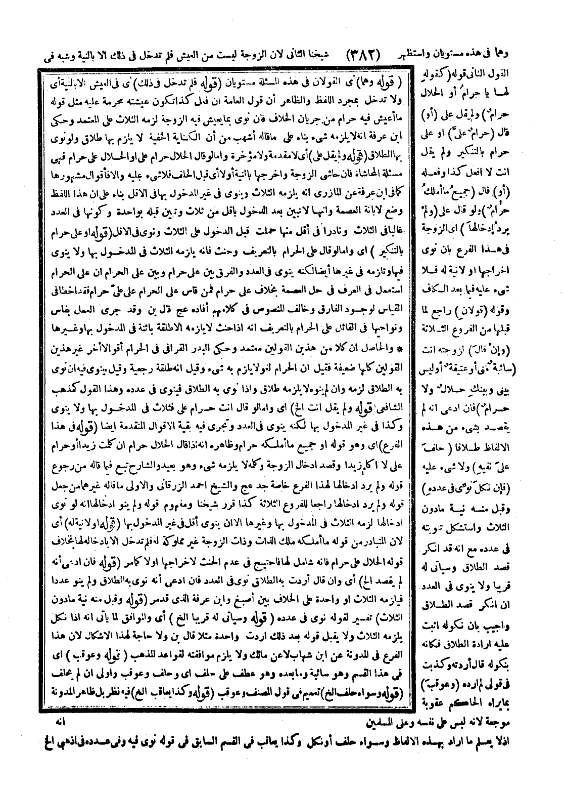 (قَوْلُهُ وَلَمْ يَقُلْ أَنْتِ إلَخْ) أَيْ وَأَمَّا لَوْ قَالَ: أَنْتِ حَرَامٌ عَلَيَّ فَثَلَاثٌ فِي الْمَدْخُولِ بِهَا وَلَا يُنَوَّى وَكَذَا فِي غَيْرِ الْمَدْخُولِ بِهَا لَكِنَّهُ يُنَوَّى فِي الْعَدَدِ وَتَجْرِي فِيهِ بَقِيَّةُ الْأَقْوَالِ الْمُتَقَدِّمَةِ أَيْضًا (قَوْلُهُ فِي هَذَا الْفَرْعِ) أَيْ وَهُوَ قَوْلُهُ أَوْ جَمِيعُ مَا أَمْلِكُهُ حَرَامٌ، وَظَاهِرُهُ أَنَّهُ إذَا قَالَ: الْحَلَالُ حَرَامٌ إنْ كَلَّمْتُ زَيْدًا أَوْ حَرَامٌ عَلَيَّ لَا أُكَلِّمُ زَيْدًا وَقَصَدَ إدْخَالَ الزَّوْجَةِ وَكَلَّمَهُ لَا يَلْزَمُهُ شَيْءٌ وَهُوَ بَعِيدٌ وَالشَّارِحُ تَبِعَ فِيمَا قَالَهُ مِنْ رُجُوعِ قَوْلِهِ وَلَمْ يُرِدْ إدْخَالَهَا لِهَذَا الْفَرْعِ خَاصَّةً جَدّ عج وَالشَّيْخُ أَحْمَدُ الزَّرْقَانِيُّ وَالْأَوْلَى مَا قَالَهُ غَيْرُهُمَا مِنْ جَعْلِ قَوْلِهِ وَلَمْ يُرِدْ إدْخَالَهَا رَاجِعًا لِلْفُرُوعِ الثَّلَاثَةِ كَذَا قَرَّرَ شَيْخُنَا. وَمَفْهُومُ قَوْلِهِ وَلَمْ يَنْوِ إدْخَالَهَا أَنَّهُ لَوْ نَوَى إدْخَالَهَا لَزِمَهُ الثَّلَاثُ فِي الْمَدْخُولِ بِهَا وَغَيْرِهَا إلَّا أَنْ يَنْوِيَ أَقَلَّ فِي غَيْرِ الْمَدْخُولِ بِهَا.