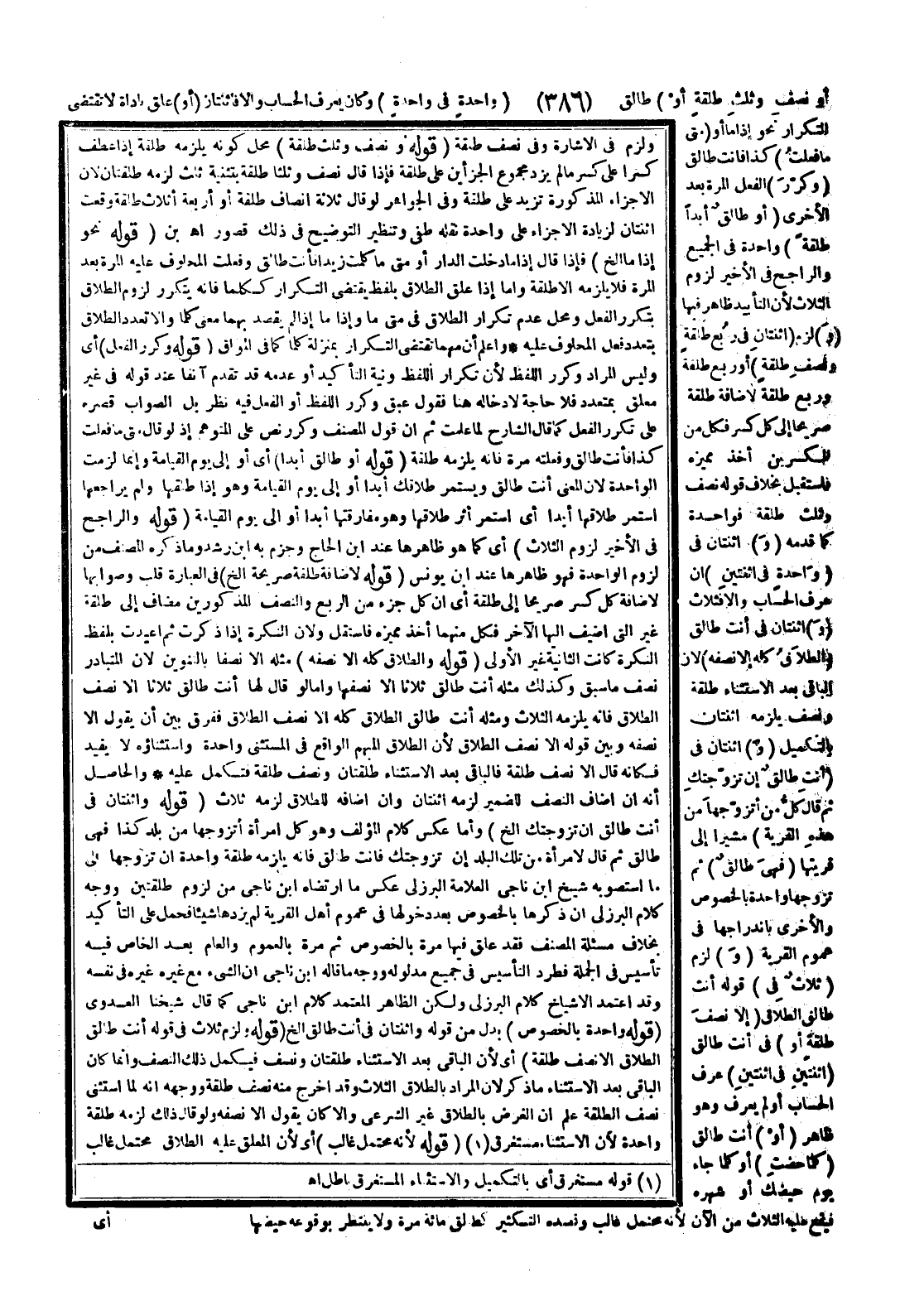 (قَوْلُهُ وَالطَّلَاقُ كُلُّهُ إلَّا نِصْفَهُ) مِثْلُهُ إلَّا نِصْفًا بِالتَّنْوِينِ؛ لِأَنَّ الْمُتَبَادَرَ نِصْفُ مَا سَبَقَ، وَكَذَلِكَ مِثْلُهُ أَنْتِ طَالِقٌ ثَلَاثًا إلَّا نِصْفَهَا، وَأَمَّا لَوْ قَالَ لَهَا أَنْت طَالِقٌ ثَلَاثًا إلَّا نِصْفَ الطَّلَاقِ فَإِنَّهُ يَلْزَمُهُ الثَّلَاثُ وَمِثْلُهُ أَنْتِ طَالِقٌ الطَّلَاقَ كُلَّهُ إلَّا نِصْفَ الطَّلَاقِ فَفَرَّقَ بَيْنَ أَنْ يَقُولَ إلَّا نِصْفَهُ وَبَيْنَ قَوْلِهِ إلَّا نِصْفَ الطَّلَاقِ؛ لِأَنَّ الطَّلَاقَ الْمُبْهَمَ الْوَاقِعَ فِي الْمُسْتَثْنَى وَاحِدَةٌ وَاسْتِثْنَاؤُهُ لَا يُفِيدُ فَكَأَنَّهُ قَالَ إلَّا نِصْفَ طَلْقَةٍ فَالْبَاقِي بَعْدَ الِاسْتِثْنَاءِ طَلْقَتَانِ وَنِصْفُ طَلْقَةٍ فَتَكْمُلُ عَلَيْهِ.