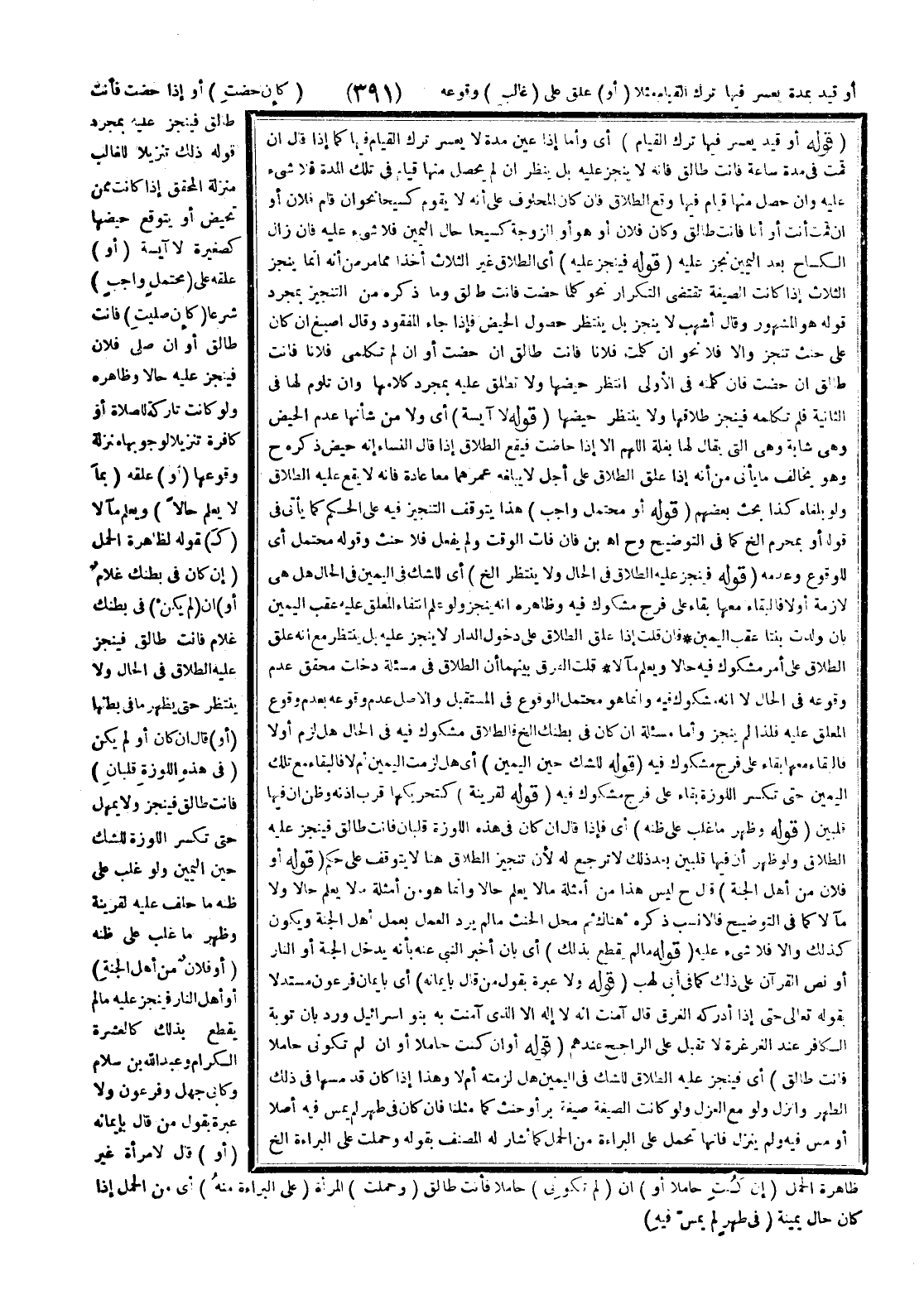 ـــــــــــــــــــــــــــــQقَوْلُهُ أَوْ قُيِّدَ بِمُدَّةٍ يَعْسُرُ فِيهَا تَرْكُ الْقِيَامِ) أَيْ وَأَمَّا إذَا عَيَّنَ مُدَّةً لَا يَعْسُرُ تَرْكُ الْقِيَامِ فِيهَا كَمَا إذَا قَالَ: إنْ قُمْت فِي مُدَّةِ سَاعَةٍ فَأَنْتِ طَالِقٌ فَإِنَّهُ لَا يُنَجَّزُ عَلَيْهِ بَلْ يُنْظَرُ إنْ لَمْ يَحْصُلْ مِنْهَا قِيَامٌ فِي تِلْكَ الْمُدَّةِ فَلَا شَيْءَ عَلَيْهِ وَإِنْ حَصَلَ مِنْهَا قِيَامٌ فِيهَا وَقَعَ الطَّلَاقُ، فَإِنْ كَانَ الْمَحْلُوفُ عَلَى أَنَّهُ لَا يَقُومُ كَسِيحًا نَحْوُ إنْ قَامَ فُلَانٌ أَوْ إنْ قُمْت أَنْتِ أَوْ أَنَا فَأَنْتِ طَالِقٌ وَكَانَ فُلَانٌ أَوْ هُوَ أَوْ الزَّوْجَةُ كَسِيحًا حَالَ الْيَمِينِ فَلَا شَيْءَ عَلَيْهِ، فَإِنْ زَالَ الْكُسَاحُ بَعْدَ الْيَمِينِ نُجِّزَ عَلَيْهِ (قَوْلُهُ فَيُنَجَّزُ عَلَيْهِ) أَيْ الطَّلَاقُ غَيْرُ الثَّلَاثِ أَخْذًا مِمَّا مَرَّ مِنْ أَنَّهُ إنَّمَا يُنَجَّزُ الثَّلَاثُ إذَا كَانَتْ الصِّيغَةُ تَقْتَضِي التَّكْرَارَ نَحْوُ كُلَّمَا حِضْت فَأَنْتِ طَالِقٌ وَمَا ذَكَرَهُ مِنْ التَّنْجِيزِ بِمُجَرَّدِ قَوْلِهِ هُوَ الْمَشْهُورُ وَقَالَ أَشْهَبُ لَا يُنَجَّزُ بَلْ يُنْتَظَرُ حُصُولُ الْحَيْضِ فَإِذَا جَاءَ الْمَفْقُودُ وَقَالَ أَصْبَغُ إنْ كَانَ عَلَى حِنْثٍ تَنَجَّزَ وَإِلَّا فَلَا نَحْوُ إنْ كَلَّمْت فُلَانًا فَأَنْتِ طَالِقٌ إنْ حِضْت أَوْ إنْ لَمْ تُكَلِّمِي فُلَانًا فَأَنْتِ طَالِقٌ إنْ حِضْت، فَإِنْ كَلَّمَتْهُ فِي الْأُولَى انْتَظَرَ حَيْضَهَا وَلَا تَطْلُقُ عَلَيْهِ بِمُجَرَّدِ كَلَامِهَا وَإِنْ تَلَوَّمَ لَهَا فِي الثَّانِيَةِ فَلَمْ تُكَلِّمْهُ فَيُنَجَّزُ طَلَاقُهَا وَلَا يُنْتَظَرُ حَيْضُهَا.