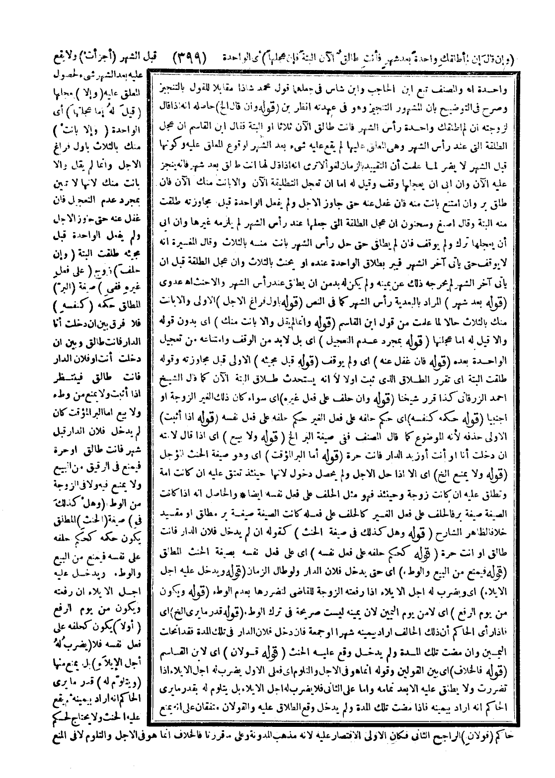 (قَوْلُهُ بَعْدَ شَهْرٍ) الْمُرَادُ بِالْبَعْدِيَّةِ رَأْسُ الشَّهْرِ كَمَا فِي النَّصِّ (قَوْلُهُ بِأَوَّلِ فَرَاغِ الْأَجَلِ) الْأَوْلَى وَإِلَّا بَانَتْ مِنْك بِالثَّلَاثِ حَالًا لِمَا عَلِمْت مِنْ قَوْلِ ابْنِ الْقَاسِمِ (قَوْلُهُ وَإِنَّمَا لَمْ يَقُلْ وَإِلَّا بَانَتْ مِنْك) أَيْ بِدُونِ قَوْلِهِ وَإِلَّا قِيلَ لَهُ إمَّا عَجَّلْتهَا (قَوْلُهُ بِمُجَرَّدِ عَدَمِ التَّعْجِيلِ) أَيْ بَلْ لَا بُدَّ مِنْ الْوَقْفِ وَامْتِنَاعِهِ مِنْ تَعْجِيلِ الْوَاحِدَةِ بَعْدَهُ (قَوْلُهُ، فَإِنْ غَفَلَ عَنْهُ) أَيْ وَلَمْ يُوقَفْ (قَوْلُهُ قَبْلَ مَجِيئِهِ) الْأَوْلَى قَبْلَ مُجَاوَزَتِهِ وَقَوْلُهُ طَلُقَتْ أَلْبَتَّةَ أَيْ تَقَرَّرَ الطَّلَاقُ الَّذِي ثَبَتَ أَوَّلًا لَا أَنَّهُ يُسْتَحْدَثُ طَلَاقُ أَلْبَتَّةَ الْآنَ كَمَا قَالَ الشَّيْخُ أَحْمَدُ الزَّرْقَانِيُّ كَذَا قَرَّرَ شَيْخُنَا
