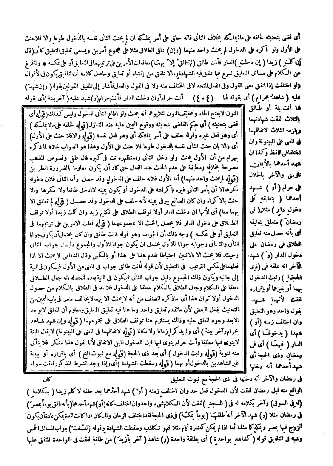 وَكَذَا إنْ شَهِدَ أَحَدُهُمَا بِالْأَيْمَانِ تَلْزَمُنِي وَالْآخَرُ بِالْحَلَالِ عَلَيَّ حَرَامٌ (أَوْ) شَهِدَ أَحَدُهُمَا (بِتَعْلِيقِهِ عَلَى دُخُولِ دَارٍ) مَثَلًا (فِي رَمَضَانَ) مُتَعَلِّقٌ بِتَعْلِيقِهِ أَيْ بِأَنَّهُ حَصَلَ مِنْهُ تَعْلِيقُ الطَّلَاقِ فِي رَمَضَانَ عَلَى دُخُولِ الدَّارِ (وَ) شَهِدَ الْآخَرُ أَنَّهُ عَلَّقَهُ فِي (ذِي الْحِجَّةِ) وَثَبَتَ الدُّخُولُ بِهِمَا أَوْ بِغَيْرِهِمَا أَوْ بِإِقْرَارِهِ لُفِّقَتْ؛ لِأَنَّهُمَا شَهِدَا بِقَوْلٍ وَاحِدٍ وَهُوَ التَّعْلِيقُ وَإِنْ اخْتَلَفَ زَمَنُهُ (أَوْ) شَهِدَا (بِدُخُولِهَا) أَيْ الدَّارَ (فِيهِمَا) أَيْ فِي رَمَضَانَ وَذِي الْحِجَّةِ أَيْ شَهِدَ أَحَدُهُمَا أَنَّهُ دَخَلَهَا فِي رَمَضَانَ وَالْآخَرُ أَنَّهُ دَخَلَهَا فِي ذِي الْحِجَّةِ مَعَ ثُبُوتِ التَّعْلِيقِ الْوَاقِعِ مِنْهُ قَبْلَ رَمَضَانَ لُفِّقَتْ؛ لِأَنَّ الدُّخُولَ فِعْلُ حَدٍّ وَإِنْ اخْتَلَفَ زَمَنُهُ (أَوْ) شَهِدَ أَحَدُهُمَا بَعْدَ حَلِفِهِ لَا كَلَّمَ زَيْدًا (بِكَلَامِهِ) (لَهُ فِي السُّوقِ) وَآخَرُ بِكَلَامِهِ لَهُ فِي (الْمَسْجِدِ) لُفِّقَتْ؛ لِأَنَّ الْكَلَامَ شَيْءٌ وَاحِدٌ وَإِنْ اخْتَلَفَ مَكَانُهُ.