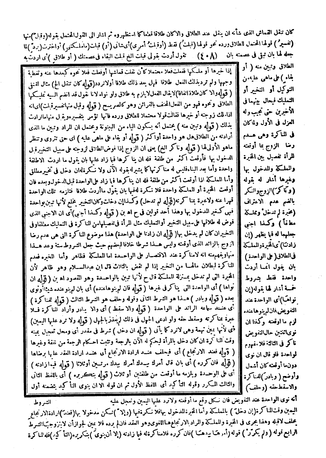 وَلَمَّا كَانَ فِي الْمُنَاكَرَةِ وَهِيَ عَدَمُ رِضَا الزَّوْجِ بِمَا أَوْقَعَتْهُ الْمَرْأَةُ تَفْصِيلٌ بَيْنَ الْمُخَيَّرَةِ وَالْمُمَلَّكَةِ وَالْمَدْخُولِ بِهَا وَغَيْرِهَا أَشَارَ لَهُ بِقَوْلِهِ (وَنَاكَرَ) الزَّوْجُ وَالنُّكُرُ بِالضَّمِّ عَدَمُ الِاعْتِرَافِ (مُخَيَّرَةً لَمْ تَدْخُلْ وَمُمَلَّكَةً مُطْلَقًا) وَكَذَا أَجْنَبِيٌّ جَعَلَهُمَا لَهُ فِيمَا يَظْهَرُ (إنْ زَادَتَا) أَيْ الْمُخَيَّرَةُ وَالْمُمَلَّكَةُ فِي الطَّلَاقِ (عَلَى الْوَاحِدَةِ) بِأَنْ يَقُولَ إنَّمَا أَرَدْت وَاحِدَةً فَقَطْ بِشُرُوطٍ خَمْسَةٍ أَشَارَ لَهَا بِقَوْلِهِ (إنْ نَوَاهَا) أَيْ الْوَاحِدَةَ عِنْدَ التَّفْوِيضِ فَإِنْ لَمْ يَنْوِهَا عِنْدَهُ لَزِمَ مَا أَوْقَعَتْهُ وَكَذَا إنْ نَوَى اثْنَتَيْنِ حَالَ التَّفْوِيضِ نَاكَرَ فِي الثَّالِثَةِ فَلَا مَفْهُومَ لِوَاحِدَةٍ، فَلَوْ قَالَ إنْ نَوَى دُونَ مَا أَوْقَعَتْهُ كَانَ أَشْمَلَ وَأَوْضَحَ (وَبَادَرَ) لِلْمُنَاكَرَةِ وَإِلَّا سَقَطَ حَقُّهُ (وَحَلَفَ) أَنَّهُ نَوَى الْوَاحِدَةَ عِنْدَ التَّفْوِيضِ فَإِنْ نَكَلَ وَقَعَ مَا أَوْقَعَتْهُ وَلَا تُرَدُّ عَلَيْهَا الْيَمِينُ وَتُعَجِّلُ عَلَيْهِ الْيَمِينَ وَقْتَ الْمُنَاكَرَةِ (إنْ دَخَلَ) بِالْمُمَلَّكَةِ وَأَمَّا الْمُخَيَّرَةُ الْمَدْخُولُ بِهَا فَلَا نَكِرَةَ فِيهَا (وَإِلَّا) تَكُنْ مَدْخُولًا بِهَا (فَعِنْدَ) إرَادَةِ الِارْتِجَاعِ يَحْلِفُ لَا قَبْلَهُ، وَهَذَا يَجْرِي فِي الْمُخَيَّرَةِ وَالْمُمَلَّكَةِ وَالْمُرَادُ بِالِارْتِجَاعِ هُنَا اللُّغَوِيِّ وَهُوَ الْعَقْدُ فَإِنْ لَمْ يَرُدَّهُ فَلَا يَمِينَ لِجَوَازِ أَنْ لَا يَتَزَوَّجَهَا. الشَّرْطُ الرَّابِعُ قَوْلُهُ (وَلَمْ يُكَرِّرْ) قَوْلُهُ (أَمْرُهَا بِيَدِهَا) فَإِنْ كَرَّرَهُ فَلَا مُنَاكَرَةَ فِيمَا زَادَتْهُ (إلَّا أَنْ يَنْوِيَ) بِتَكْرِيرِهِ (التَّأْكِيدَ) فَلَهُ الْمُنَاكَرَةُ