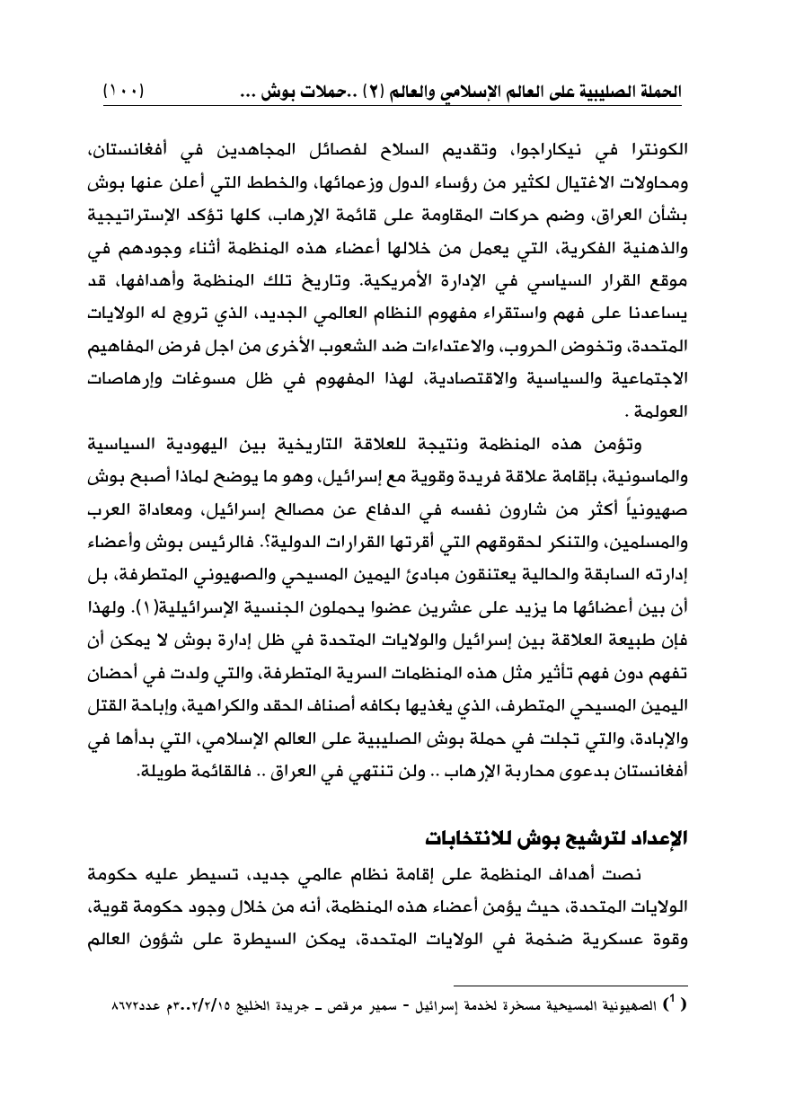 وتؤمن هذه المنظمة ونتيجة للعلاقة التاريخية بين اليهودية السياسية والماسونية، بإقامة علاقة فريدة وقوية مع إسرائيل، وهو ما يوضح لماذا أصبح بوش صهيونياً أكثر من شارون نفسه في الدفاع عن مصالح إسرائيل، ومعاداة العرب والمسلمين، والتنكر لحقوقهم التي أقرتها القرارات الدولية؟. فالرئيس بوش وأعضاء إدارته السابقة والحالية يعتنقون مبادئ اليمين المسيحي والصهيوني المتطرفة، بل أن بين أعضائها ما يزيد على عشرين عضوا يحملون الجنسية الإسرائيلية (¬1). ولهذا فإن طبيعة العلاقة بين إسرائيل والولايات المتحدة في ظل إدارة بوش لا يمكن أن تفهم دون فهم تأثير مثل هذه المنظمات السرية المتطرفة، والتي ولدت في أحضان اليمين المسيحي المتطرف، الذي يغذيها بكافه أصناف الحقد والكراهية، وإباحة القتل والإبادة، والتي تجلت في حملة بوش الصليبية على العالم الإسلامي، التي بدأها في أفغانستان بدعوى محاربة الإرهاب .. ولن تنتهي في العراق .. فالقائمة طويلة.