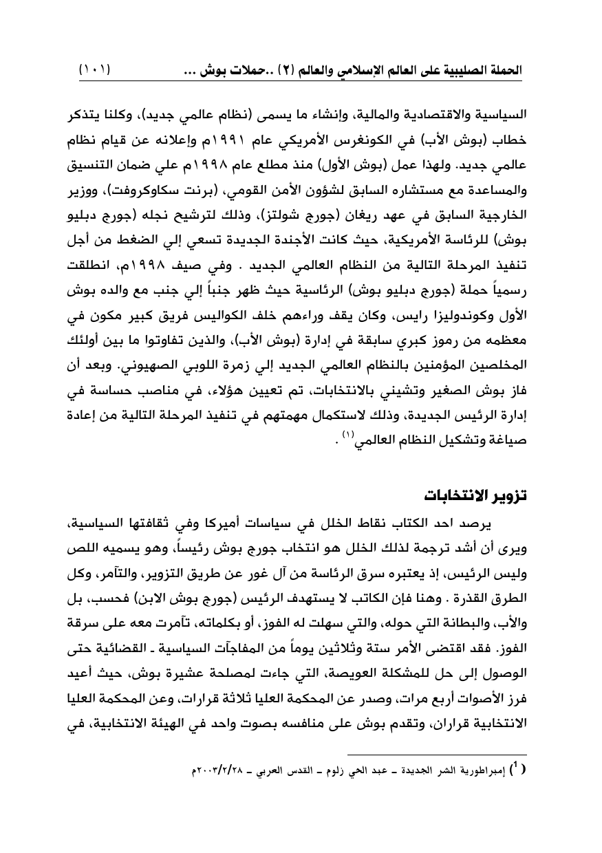 السياسية والاقتصادية والمالية، وإنشاء ما يسمى (نظام عالمي جديد)، وكلنا يتذكر خطاب (بوش الأب) في الكونغرس الأمريكي عام 1991م وإعلانه عن قيام نظام عالمي جديد. ولهذا عمل (بوش الأول) منذ مطلع عام 1998م علي ضمان التنسيق والمساعدة مع مستشاره السابق لشؤون الأمن القومي، (برنت سكاوكروفت)، ووزير الخارجية السابق في عهد ريغان (جورج شولتز)، وذلك لترشيح نجله (جورج دبليو بوش) للرئاسة الأمريكية، حيث كانت الأجندة الجديدة تسعي إلي الضغط من أجل تنفيذ المرحلة التالية من النظام العالمي الجديد. وفي صيف 1998م، انطلقت رسمياً حملة (جورج دبليو بوش) الرئاسية حيث ظهر جنباً إلي جنب مع والده بوش الأول وكوندوليزا رايس، وكان يقف وراءهم خلف الكواليس فريق كبير مكون في معظمه من رموز كبري سابقة في إدارة (بوش الأب)، والذين تفاوتوا ما بين أولئك المخلصين المؤمنين بالنظام العالمي الجديد إلي زمرة اللوبي الصهيوني. وبعد أن فاز بوش الصغير وتشيني بالانتخابات، تم تعيين هؤلاء، في مناصب حساسة في إدارة الرئيس الجديدة، وذلك لاستكمال مهمتهم في تنفيذ المرحلة التالية من إعادة صياغة وتشكيل النظام العالمي (¬1).