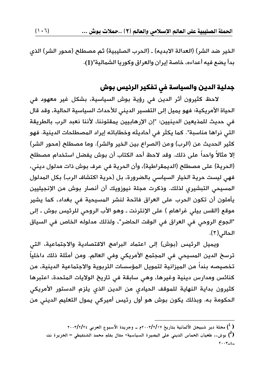 الخير ضد الشر) (العدالة الابديه) ـ (الحرب الصليبية) ثم مصطلح (محور الشر) الذي بدأ يضع فيه أعداءه، خاصة إيران والعراق وكوريا الشمالية" (¬1).