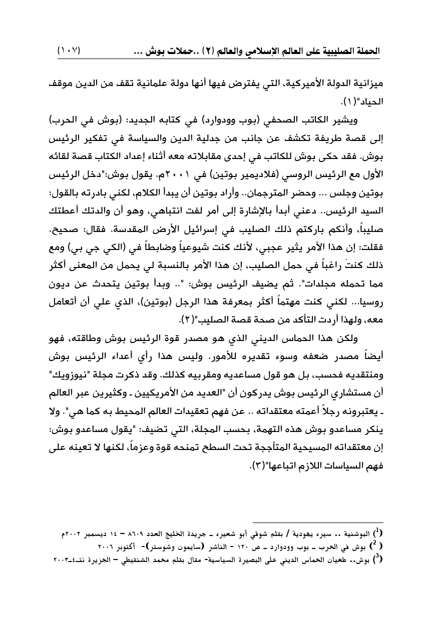 ويشير الكاتب الصحفي (بوب وودوارد) في كتابه الجديد: (بوش في الحرب) إلى قصة طريفة تكشف عن جانب من جدلية الدين والسياسة في تفكير الرئيس بوش. فقد حكى بوش للكاتب في إحدى مقابلاته معه أثناء إعداد الكتاب قصة لقائه الأول مع الرئيس الروسي (فلاديمير بوتين) في 2001م. يقول بوش:"دخل الرئيس بوتين وجلس ... وحضر المترجمان .. وأراد بوتين أن يبدأ الكلام، لكني بادرته بالقول: السيد الرئيس .. دعني أبدأ بالإشارة إلى أمر لفت انتباهي، وهو أن والدتك أعطتك صليباً، وأنكم باركتم ذلك الصليب في إسرائيل الأرض المقدسة. فقال: صحيح. فقلت: إن هذا الأمر يثير عجبي، لأنك كنت شيوعياً وضابطاً في (الكي جي بي) ومع ذلك كنتَ راغباً في حمل الصليب، إن هذا الأمر بالنسبة لي يحمل من المعنى أكثر مما تحمله مجلدات". ثم يضيف الرئيس بوش: " .. وبدأ بوتين يتحدث عن ديون روسيا ... لكني كنت مهتماً أكثر بمعرفة هذا الرجل (بوتين)، الذي علي أن أتعامل معه، ولهذا أردت التأكد من صحة قصة الصليب" (¬2). http://www.aljazeera.net/cases_analysis/2003/3/3-11-1.htm - TOP