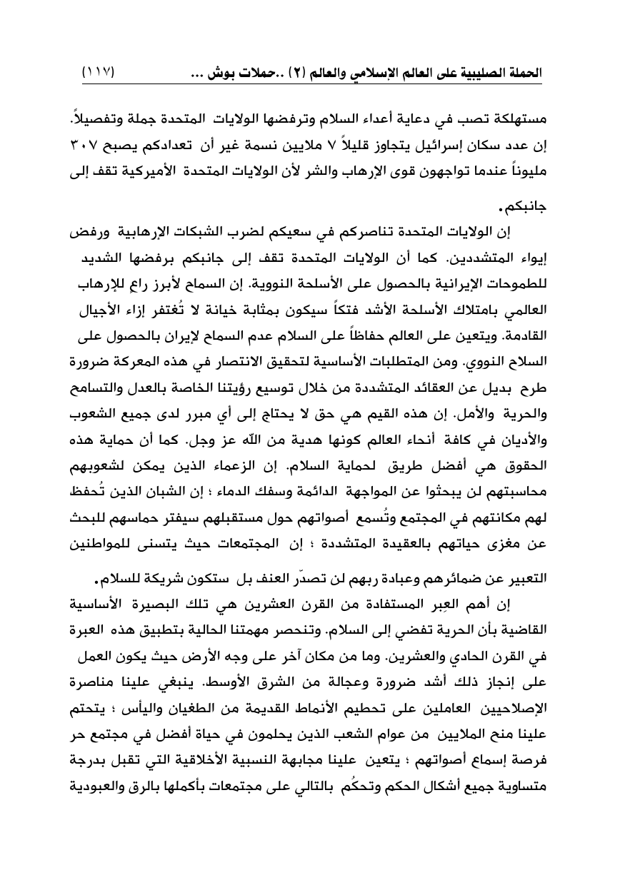 إن الولايات المتحدة تناصركم في سعيكم لضرب الشبكات الإرهابية ورفض إيواء المتشددين. كما أن الولايات المتحدة تقف إلى جانبكم برفضها الشديد للطموحات الإيرانية بالحصول على الأسلحة النووية. إن السماح لأبرز راعٍ للإرهاب العالمي بامتلاك الأسلحة الأشد فتكاً سيكون بمثابة خيانة لا تُغتفر إزاء الأجيال القادمة. ويتعين على العالم حفاظاً على السلام عدم السماح لإيران بالحصول على السلاح النووي. ومن المتطلبات الأساسية لتحقيق الانتصار في هذه المعركة ضرورة طرح بديل عن العقائد المتشددة من خلال توسيع رؤيتنا الخاصة بالعدل والتسامح والحرية والأمل. إن هذه القيم هي حق لا يحتاج إلى أي مبرر لدى جميع الشعوب والأديان في كافة أنحاء العالم كونها هدية من الله عز وجل. كما أن حماية هذه الحقوق هي أفضل طريق لحماية السلام. إن الزعماء الذين يمكن لشعوبهم محاسبتهم لن يبحثوا عن المواجهة الدائمة وسفك الدماء؛ إن الشبان الذين تُحفظ لهم مكانتهم في المجتمع وتُسمع أصواتهم حول مستقبلهم سيفتر حماسهم للبحث عن مغزى حياتهم بالعقيدة المتشددة؛ إن المجتمعات حيث يتسنى للمواطنين التعبير عن ضمائرهم وعبادة ربهم لن تصدّر العنف بل ستكون شريكة للسلام.