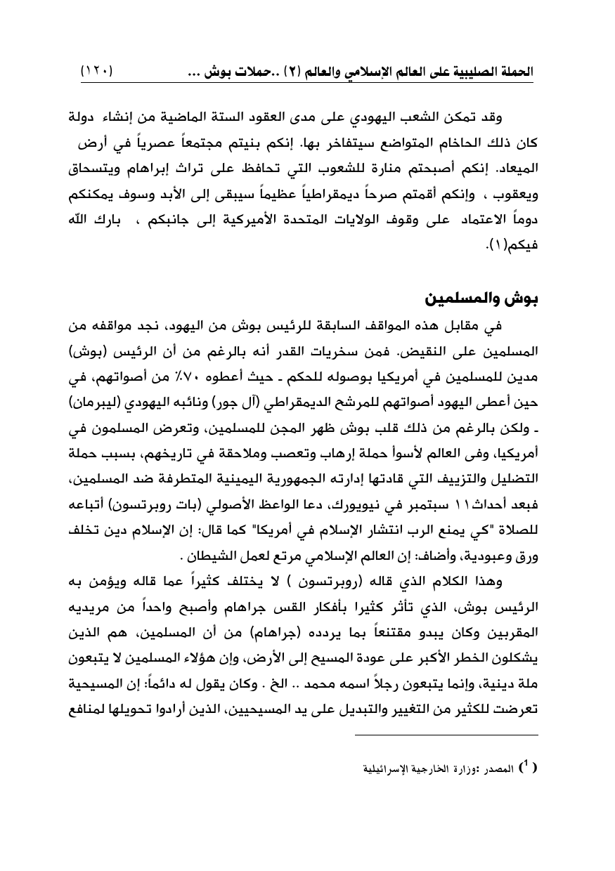 وهذا الكلام الذي قاله (روبرتسون) لا يختلف كثيراً عما قاله ويؤمن به الرئيس بوش، الذي تأثر كثيرا بأفكار القس جراهام وأصبح واحداً من مريديه المقربين وكان يبدو مقتنعاً بما يردده (جراهام) من أن المسلمين، هم الذين يشكلون الخطر الأكبر على عودة المسيح إلى الأرض، وإن هؤلاء المسلمين لا يتبعون ملة دينية، وإنما يتبعون رجلاً اسمه محمد .. الخ. وكان يقول له دائماً: إن المسيحية تعرضت للكثير من التغيير والتبديل على يد المسيحيين، الذين أرادوا تحويلها لمنافع
