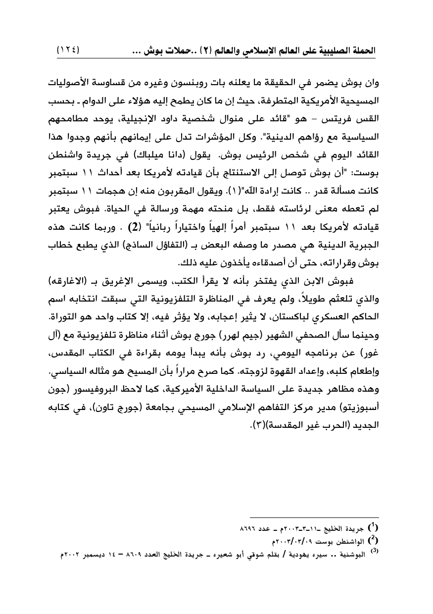 فبوش الابن الذي يفتخر بأنه لا يقرأ الكتب، ويسمى الإغريق بـ (الاغارقه) والذي تلعثم طويلاً، ولم يعرف في المناظرة التلفزيونية التي سبقت انتخابه اسم الحاكم العسكري لباكستان، لا يثير إعجابه، ولا يؤثر فيه، إلا كتاب واحد هو التوراة. وحينما سأل الصحفي الشهير (جيم لهرر) جورج بوش أثناء مناظرة تلفزيونية مع (آل غور) عن برنامجه اليومي، رد بوش بأنه يبدأ يومه بقراءة في الكتاب المقدس، وإطعام كلبه، وإعداد القهوة لزوجته. كما صرح مراراً بأن المسيح هو مثاله السياسي. وهذه مظاهر جديدة على السياسة الداخلية الأميركية، كما لاحظ البروفيسور (جون أسبوزيتو) مدير مركز التفاهم الإسلامي المسيحي بجامعة (جورج تاون)، في كتابه الجديد (الحرب غير المقدسة) (¬3).
