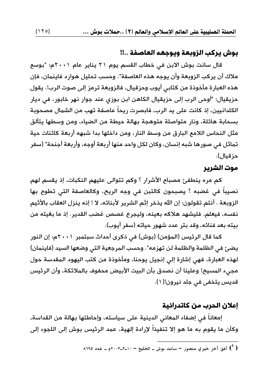 إمعاناً في إضفاء المعاني الدينية على سياسته، وإحاطتها بهالة من القداسة، وكأن ما يقوم به ما هو إلا تنفيذاً لإرادة إلهية، عمد الرئيس بوش إلى اللجوء إلى