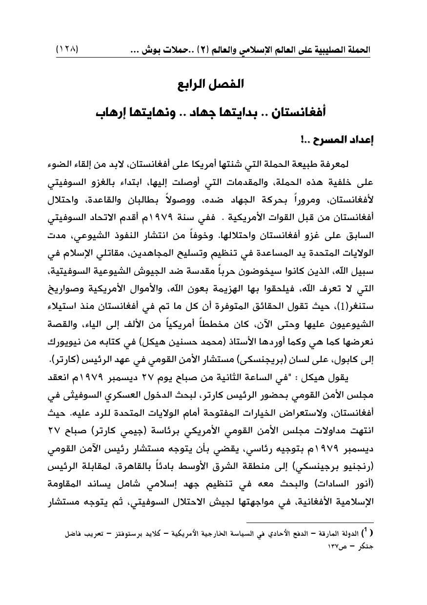 لمعرفة طبيعة الحملة التي شنتها أمريكا على أفغانستان، لابد من إلقاء الضوء على خلفية هذه الحملة، والمقدمات التي أوصلت إليها، ابتداء بالغزو السوفيتي لأفغانستان، ومروراً بحركة الجهاد ضده، ووصولاً بطالبان والقاعدة، واحتلال أفغانستان من قبل القوات الأمريكية. ففي سنة 1979م أقدم الاتحاد السوفيتي السابق على غزو أفغانستان واحتلالها. وخوفاً من انتشار النفوذ الشيوعي، مدت الولايات المتحدة يد المساعدة في تنظيم وتسليح المجاهدين، مقاتلي الإسلام في سبيل الله، الذين كانوا سيخوضون حرباً مقدسة ضد الجيوش الشيوعية السوفيتية، التي لا تعرف الله، فيلحقوا بها الهزيمة بعون الله، والأموال الأمريكية وصواريخ ستنغر (¬1)، حيث تقول الحقائق المتوفرة أن كل ما تم في أفغانستان منذ استيلاء الشيوعيون عليها وحتى الآن، كان مخططاً أمريكياً من الألف إلى الياء، والقصة نعرضها كما هي وكما أوردها الأستاذ (محمد حسنين هيكل) في كتابه من نيويورك إلى كابول، على لسان (بريجنسكى) مستشار الأمن القومي في عهد الرئيس (كارتر).