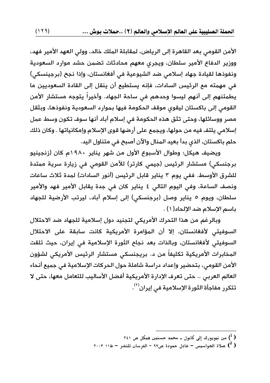 الأمن القومي بعد القاهرة إلى الرياض، لمقابلة الملك خالد، وولي العهد الأمير فهد، ووزير الدفاع الأمير سلطان، ويجري معهم محادثات تضمن حشد موارد السعودية ونفوذها لقيادة جهاد إسلامي ضد الشيوعية في أفغانستان، وإذا نجح (برجينسكي) في مهمته مع الرئيس السادات، فإنه يستطيع أن ينقل إلى القادة السعوديين ما يطمئنهم إلى أنهم ليسوا وحدهم في ساحة الجهاد. وأخيراً يتوجه مستشار الأمن القومي إلى باكستان ليقوي موقف الحكومة فيها بموارد السعودية ونفوذها، وبثقل مصر ووسائلها، وحتى تثق هذه الحكومة في إسلام أباد أنها سوف تكون وسط عمل إسلامي يلتف فيه من حولها، ويجمع على أرضها قوى الإسلام وإمكانياتها. وكان ذلك حلم باكستان، الذي بدأ بعيد المنال والآن أصبح في متناول اليد.