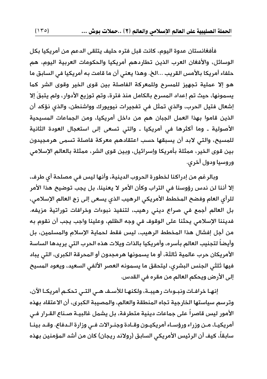 فأفغانستان عدوة اليوم، كانت قبل فتره حليف يتلقى الدعم من أمريكيا بكل الوسائل، والأفغان العرب الذين تطاردهم أمريكيا والحكومات العربية اليوم، هم حلفاء أمريكا بالأمس القريب ... الخ. وهذا يعني أن ما قامت به أمريكيا في السابق ما هو إلا عملية تجهيز للمسرح وللمعركة الفاصلة بين قوى الخير وقوى الشر كما يسمونها، حيث تم إعداد المسرح بالكامل منذ فترة، وتم توزيع الأدوار، ولم يتبقَ إلا إشعال فتيل الحرب، والذي تمثل في تفجيرات نيويورك وواشنطن، والذي نؤكد أن الذين قاموا بهذا العمل الجبان هم من داخل أمريكيا، ومن الجماعات المسيحية الأصولية ـ وما أكثرها في أمريكيا ـ والتي تسعى إلى استعجال العودة الثانية للمسيح، والتي لابد أن يسبقها حسب اعتقادهم معركة فاصلة تسمى هرمجيدون بين قوى الخير، ممثلة بأمريكا وإسرائيل، وبين قوى الشر، ممثلة بالعالم الإسلامي وروسيا ودول أخري.