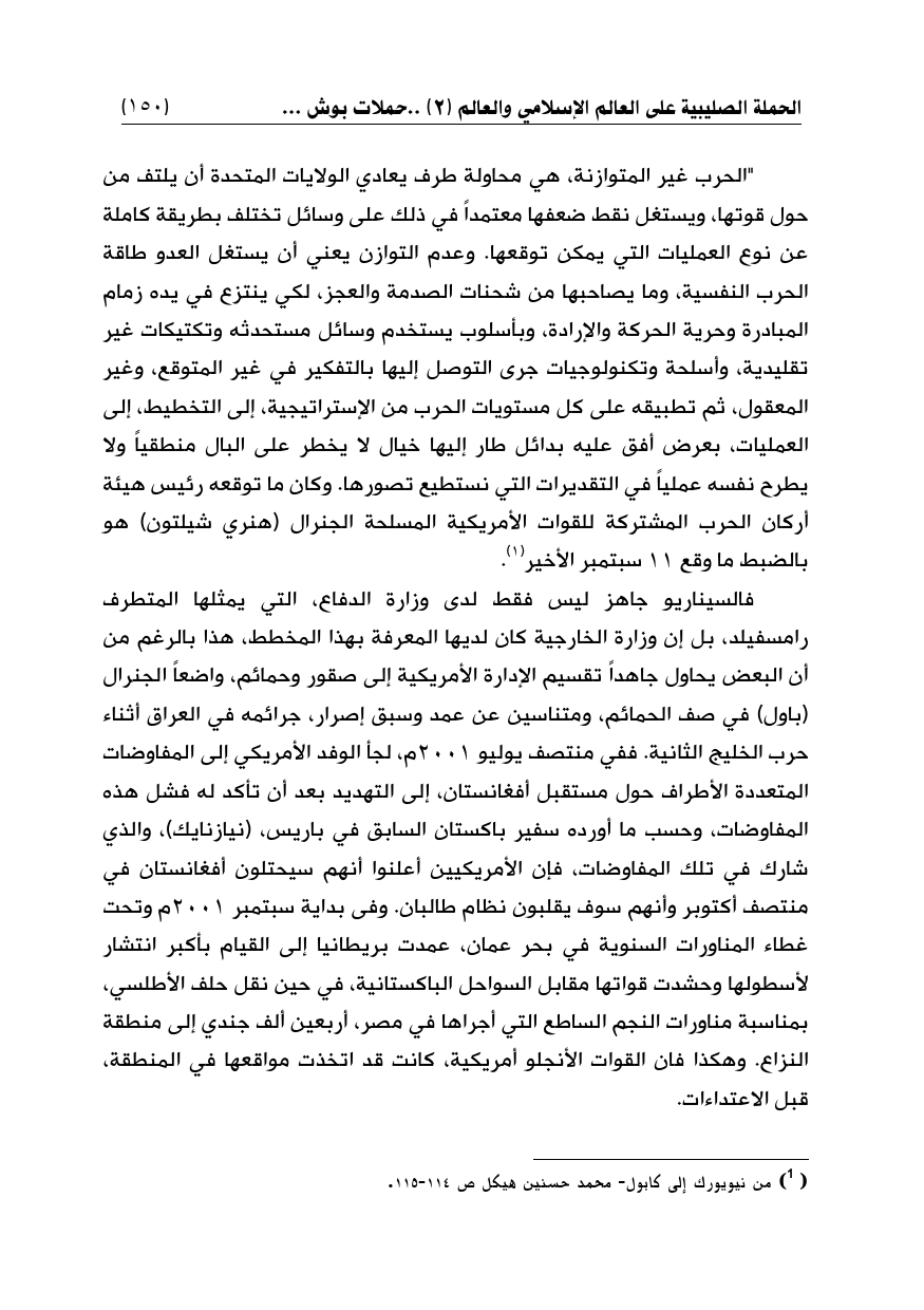 "الحرب غير المتوازنة، هي محاولة طرف يعادي الولايات المتحدة أن يلتف من حول قوتها، ويستغل نقط ضعفها معتمداً في ذلك على وسائل تختلف بطريقة كاملة عن نوع العمليات التي يمكن توقعها. وعدم التوازن يعني أن يستغل العدو طاقة الحرب النفسية، وما يصاحبها من شحنات الصدمة والعجز، لكي ينتزع في يده زمام المبادرة وحرية الحركة والإرادة، وبأسلوب يستخدم وسائل مستحدثه وتكتيكات غير تقليدية، وأسلحة وتكنولوجيات جرى التوصل إليها بالتفكير في غير المتوقع، وغير المعقول، ثم تطبيقه على كل مستويات الحرب من الإستراتيجية، إلى التخطيط، إلى العمليات، بعرض أفق عليه بدائل طار إليها خيال لا يخطر على البال منطقياً ولا يطرح نفسه عملياً في التقديرات التي نستطيع تصورها. وكان ما توقعه رئيس هيئة أركان الحرب المشتركة للقوات الأمريكية المسلحة الجنرال (هنري شيلتون) هو بالضبط ما وقع 11 سبتمبر الأخير (¬1).
