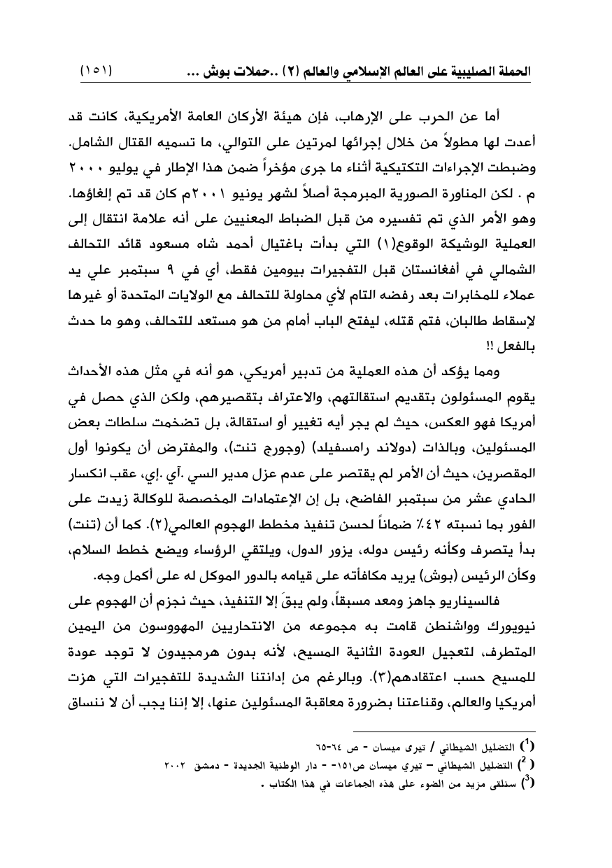 فالسيناريو جاهز ومعد مسبقاً، ولم يبقَ إلا التنفيذ، حيث نجزم أن الهجوم على نيويورك وواشنطن قامت به مجموعه من الانتحاريين المهووسون من اليمين المتطرف، لتعجيل العودة الثانية المسيح، لأنه بدون هرمجيدون لا توجد عودة للمسيح حسب اعتقادهم (¬3). وبالرغم من إدانتنا الشديدة للتفجيرات التي هزت أمريكيا والعالم، وقناعتنا بضرورة معاقبة المسئولين عنها، إلا إننا يجب أن لا ننساق