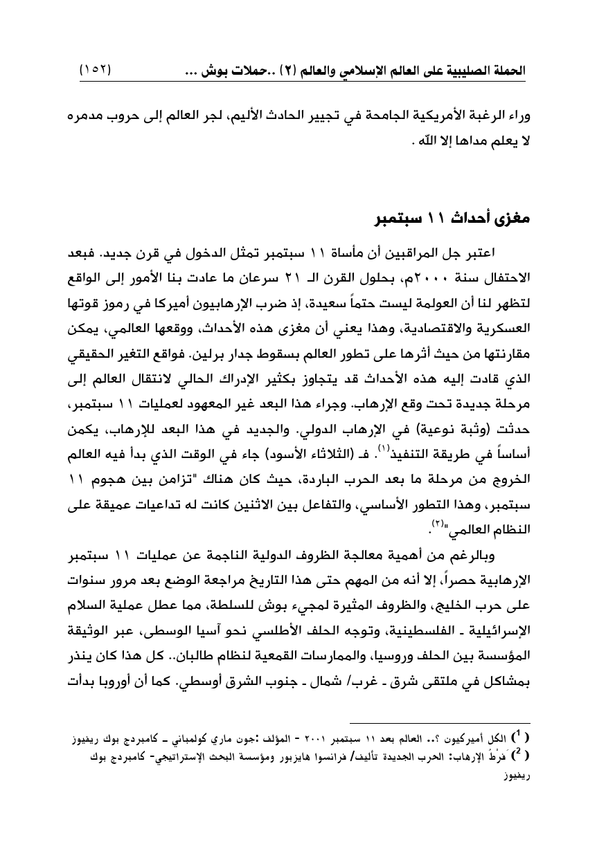 اعتبر جل المراقبين أن مأساة 11 سبتمبر تمثل الدخول في قرن جديد. فبعد الاحتفال سنة 2000م، بحلول القرن الـ 21 سرعان ما عادت بنا الأمور إلى الواقع لتظهر لنا أن العولمة ليست حتماً سعيدة، إذ ضرب الإرهابيون أميركا في رموز قوتها العسكرية والاقتصادية، وهذا يعني أن مغزى هذه الأحداث، ووقعها العالمي، يمكن مقارنتها من حيث أثرها على تطور العالم بسقوط جدار برلين. فواقع التغير الحقيقي الذي قادت إليه هذه الأحداث قد يتجاوز بكثير الإدراك الحالي لانتقال العالم إلى مرحلة جديدة تحت وقع الإرهاب. وجراء هذا البعد غير المعهود لعمليات 11 سبتمبر، حدثت (وثبة نوعية) في الإرهاب الدولي. والجديد في هذا البعد للإرهاب، يكمن أساساً في طريقة التنفيذ (¬1). فـ (الثلاثاء الأسود) جاء في الوقت الذي بدأ فيه العالم الخروج من مرحلة ما بعد الحرب الباردة، حيث كان هناك "تزامن بين هجوم 11 سبتمبر، وهذا التطور الأساسي, والتفاعل بين الاثنين كانت له تداعيات عميقة على النظام العالمي" (¬2).
