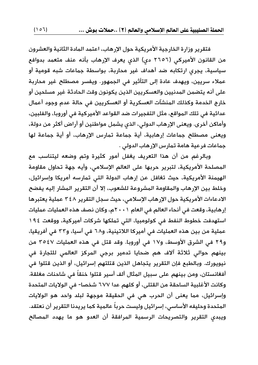 وبالرغم من أن هذا التعريف يغفل أمور كثيرة وتم وضعه ليتناسب مع المصلحة الأمريكية، لتبرير حربها على العالم الإسلامي، وأيه جهة تحاول مقاومة الهيمنة الأمريكية، حيث تغافل عن إرهاب الدولة التي تمارسه أمريكا وإسرائيل، وخلط بين الإرهاب والمقاومة المشروعة للشعوب، إلا أن التقرير المشار إليه يفضح الادعاءات الأمريكية حول الإرهاب الإسلامي، http://www.aljazeera.net/NR/exeres/ حيث سجل التقرير 348 عملية يعتبرها إرهابية، وقعت في أنحاء العالم في العام 2001م، وكان نصف هذه العمليات عمليات استهدفت خطوط النفط في كولومبيا، التي تملكها شركات أميركية، ووقعت 194 عملية من بين هذه العمليات في أميركا اللاتينية، و68 في آسيا، و33 في أفريقيا، و29 في الشرق الأوسط، و17 في أوروبا. وقد قتل في هذه العمليات 3547 من بينهم حوالي ثلاثة آلاف هم ضحايا تدمير برجي المركز العالمي للتجارة في نيويورك. وبالطبع فإن التقرير يتجاهل الذين قتلتهم إسرائيل، أو الذين قتلوا في أفغانستان، ومن بينهم على سبيل المثال ألف أسير قتلوا خنقاً في شاحنات مغلقة. وكانت الأغلبية الساحقة من القتلى، أو كلهم عدا 677 شخصا- في الولايات المتحدة وإسرائيل، مما يعنى أن الحرب هي في الحقيقة موجهة لبلد واحد هو الولايات المتحدة وحليفه الأساسي، إسرائيل وليست حرباً عالمية كما يريدنا التقرير أن نعتقد. ويبدي التقرير والتصريحات الرسمية المرافقة أن العدو هو ما يهدد المصالح