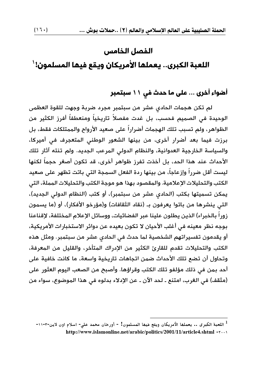 لم تكن هجمات الحادي عشر من سبتمبر مجرد ضربة وجهت للقوة العظمى الوحيدة في الصميم فحسب، بل غدت مفصلاً تاريخياً ومنعطفاً أفرز الكثير من الظواهر، ولم تسبب تلك الهجمات أضراراً على صعيد الأرواح والممتلكات فقط، بل برزت فيما بعد أضرار أخرى، من بينها الشعور الوطني المتعجرف في أميركا، والسياسة الخارجية العدوانية، والنظام الدولي المرعب الجديد. ولم تنته آثار تلك الأحداث عند هذا الحد، بل أخذت تفرز ظواهر أخرى، قد تكون أصغر حجماً لكنها ليست أقل ضرراً وإزعاجاً، من بينها ردة الفعل السمجة التي باتت تظهر على صعيد الكتب والتحليلات الإعلامية. والمقصود بهذا هو موجة الكتب والتحليلات المملة، التي يمكن تسميتها بكتب (الحادي عشر من سبتمبر)، أو كتب (النظام الدولي الجديد)، التي ينشرها من باتوا يعرفون بـ (نقاد الثقافات) و (مؤرخو الأفكار)، أو (ما يسمون زوراً بالخبراء) الذين يطلون علينا عبر الفضائيات، ووسائل الإعلام المختلفة، لإقناعنا بوجه نظر معينه في أغلب الأحيان لا تكون بعيده عن دوائر الاستخبارات الأمريكية، أو يقدمون تفسيراتهم الشخصية لما حدث في الحادي عشر من سبتمبر. ومثل هذه الكتب والتحليلات تقدم للقارئ الكثير من الإدراك المتأخر، والقليل من المعرفة، وتحاول أن تضع تلك الأحداث ضمن اتجاهات تاريخية واسعة، ما كانت خافية على أحد بمن في ذلك مؤلفو تلك الكتب وقراؤها. وأصبح من الصعب اليوم العثور على (مثقف) في الغرب، امتنع ـ لحد الآن ـ عن الإدلاء بدلوه في هذا الموضوع، سواء من