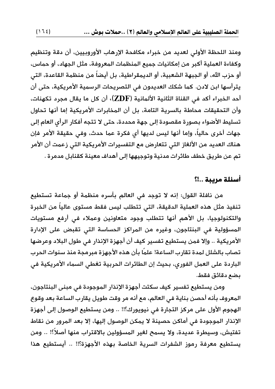 ومن يستطيع تفسير كيف سكتت أجهزة الإنذار الموجودة في مبنى البنتاجون، المعروف بأنه أحصن بناية في العالم، مع أنه مر وقت طويل يقارب الساعة بعد وقوع الهجوم الأول على مركز التجارة في نيويورك؟!! .. ومن يستطيع الوصول إلى أجهزة الإنذار الموجودة في أماكن حصينة لا يمكن الوصول إليها، إلا بعد المرور من نقاط تفتيش، وسيطرة عديدة، ولا يسمح لغير المسؤولين بالاقتراب منها أصلاً؟! .. ومن يستطيع معرفة رموز الشفرات السرية الخاصة بهذه الأجهزة؟!! .. أيستطيع هذا