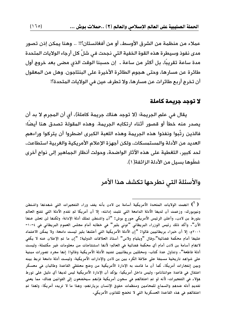 (¬1) اتهمت الولايات المتحدة الأمريكية أسامة بن لادن بأنه يقف وراء التفجيرات التي شهدتها واشنطن ونيويورك، وزعمت أن لديها الأدلة الدامغة التي تثبت إدانته، إلا أن أمريكا لم تقدم الأدلة التي تقنع العالم بتورط بن لادن. وأعلن الرئيس الأمريكي جورج بوش: "أن واشنطن تملك أدلة الإدانة، ولكنها لن تعلن عنها الآن". وأكد ذلك رئيس الوزراء البريطاني "توني بلير" في خطابه أمام مجلس العموم البريطاني في 4 - 10 - 2001م، إلا أن خبراء بريطانيين قالوا: "إن الأدلة الأمريكية التي أعلنها بلير ليست دامغة، ولا يمكن الاعتماد عليها أمام محكمة قضائية".وقال "ويليام ولاس" أستاذ العلاقات الدولية: "إن ما تم الإعلان عنه لا يكفي لاتهام أسامة بن لادن أمام أي محكمة قضائية في العالم؛ لأنها استنتاجات من معلومات غير مكتملة، وليست أدلة قاطعة". وتناول عدة كتاب، ومحللين بريطانيين تفنيد الأدلة الأمريكية وقالوا: إنها مجرد تصورات مبنية على شواهد تاريخية مسبقة على علاقة الكره بين بن لادن والإدارات الأمريكية، وليست أدلة دامغة تربط بينه وبين إنفجارات أمريكا .. كما أن ما قامت به الإدارة الأمريكية من وضع معتقلي القاعدة وطالبان في معسكر اعتقال في قاعدة جوانتانامو، وليس داخل أمريكيا، يؤكد أن الإدارة الأمريكية ليس لديها أي دليل على تورط هؤلاء في التفجيرات، لأنه لو تم اعتقالهم في سجون أمريكية فإنهم سيخضعون إلى القوانين هناك، مما يعنى تقديم أدله ضدهم والسماح للمحامين ومنظمات حقوق الإنسان بزيارتهم، وهذا ما لا تريده أمريكا، ولهذا تم اعتقالهم في هذه القاعدة العسكرية التي لا تخضع للقانون الأمريكي.