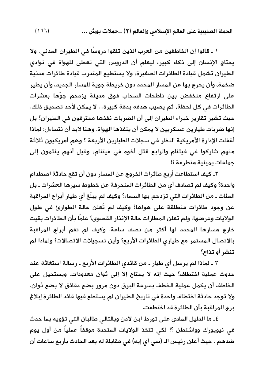 1 ـ قالوا إن الخاطفين من العرب الذين تلقوا دروسًا في الطيران المدني. ولا يحتاج الإنسان إلى ذكاء كبير، ليعلم أن الدروس التي تعطى للهواة في نوادي الطيران تشمل قيادة الطائرات الصغيرة، ولا يستطيع المتدرب قيادة طائرات مدنية ضخمة، وأن يخرج بها عن المسار المحدد دون خريطة جوية للمسار الجديد، وأن يطير على ارتفاع منخفض بين ناطحات السحاب فوق مدينة يزدحم جوّها بعشرات الطائرات في كل لحظة، ثم يصيب هدفه بدقة كبيرة ... لا يمكن لأحد تصديق ذلك. حيث تشير تقارير خبراء الطيران إلى أن الضربات نفذها محترفون في الطيران؟ بل إنها ضربات طيارين عسكريين لا يمكن أن ينفذها الهواة. وهنا لابد أن نتساءل: لماذا أغفلت الإدارة الأمريكية النظر في سجلات الطيارين الأربعة؟ وهم أمريكيون ثلاثة منهم شاركوا في فيتنام والرابع قتل أخوه في فيتنام، وقيل أنهم ينتمون إلى جماعات يمينية متطرفة؟!