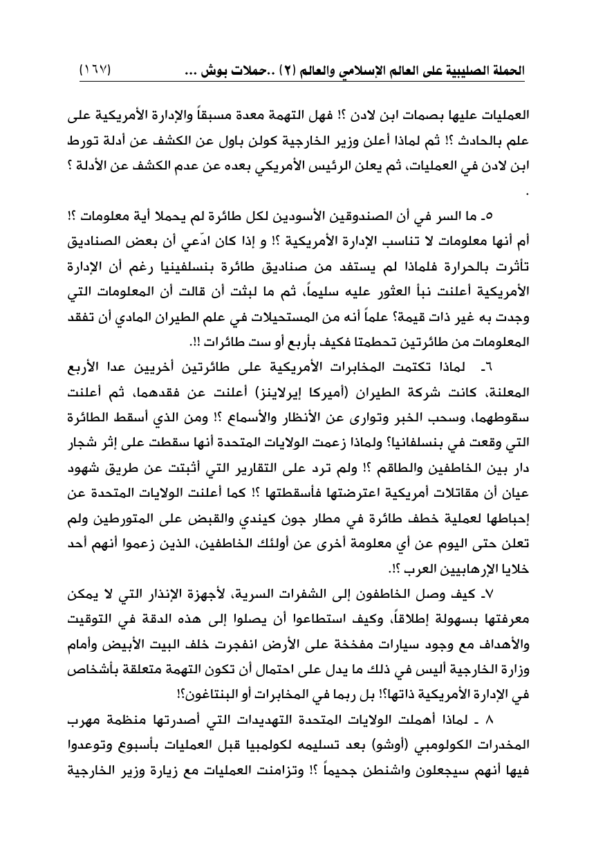 العمليات عليها بصمات ابن لادن؟! فهل التهمة معدة مسبقاً والإدارة الأمريكية على علم بالحادث؟! ثم لماذا أعلن وزير الخارجية كولن باول عن الكشف عن أدلة تورط ابن لادن في العمليات، ثم يعلن الرئيس الأمريكي بعده عن عدم الكشف عن الأدلة؟.
