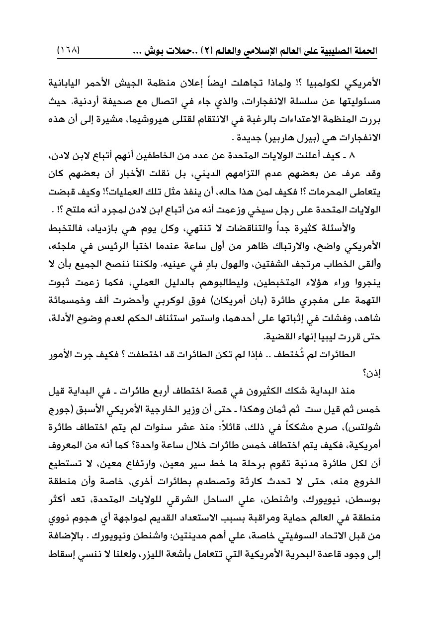 والأسئلة كثيرة جداً والتناقضات لا تنتهي، وكل يوم هي بازدياد، فالتخبط الأمريكي واضح، والارتباك ظاهر من أول ساعة عندما اختبأ الرئيس في ملجئه، وألقى الخطاب مرتجف الشفتين، والهول بادٍ في عينيه. ولكننا ننصح الجميع بأن لا ينجروا وراء هؤلاء المتخبطين، وليطالبوهم بالدليل العملي، فكما زعمت ثبوت التهمة على مفجري طائرة (بان أمريكان) فوق لوكربي وأحضرت ألف وخمسمائة شاهد، وفشلت في إثباتها على أحدهما، واستمر استئناف الحكم لعدم وضوح الأدلة، حتى قررت ليبيا إنهاء القضية.