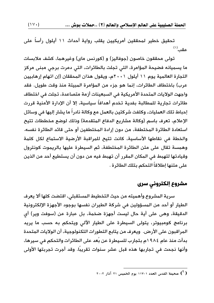 سرية المشروع وأهميته من حيث التخطيط المستقبلي، اقتضت كلها ألا يعرف الطيار أو أحد من المسؤولين في شركة الطيران نفسها بوجود الأجهزة الإلكترونية الدقيقة، وهى على أية حال ليست أجهزة ضخمة، بل عبارة عن (سوفت وير) أي برنامج كومبيوتر، يتولى السيطرة على الطيار الآلي ويتحكم به حسب ما يريد المراقبون على الأرض. ويعرف من يتابع التطورات التكنولوجية، أن الولايات المتحدة بدأت منذ عام 1984م بتجارب للسيطرة عن بُعد على الطائرات والتحكم في سيرها، وأنها نجحت في تجاربها هذه قبل عشر سنوات تقريبًا. وقد أجرت تجربتها الأولى