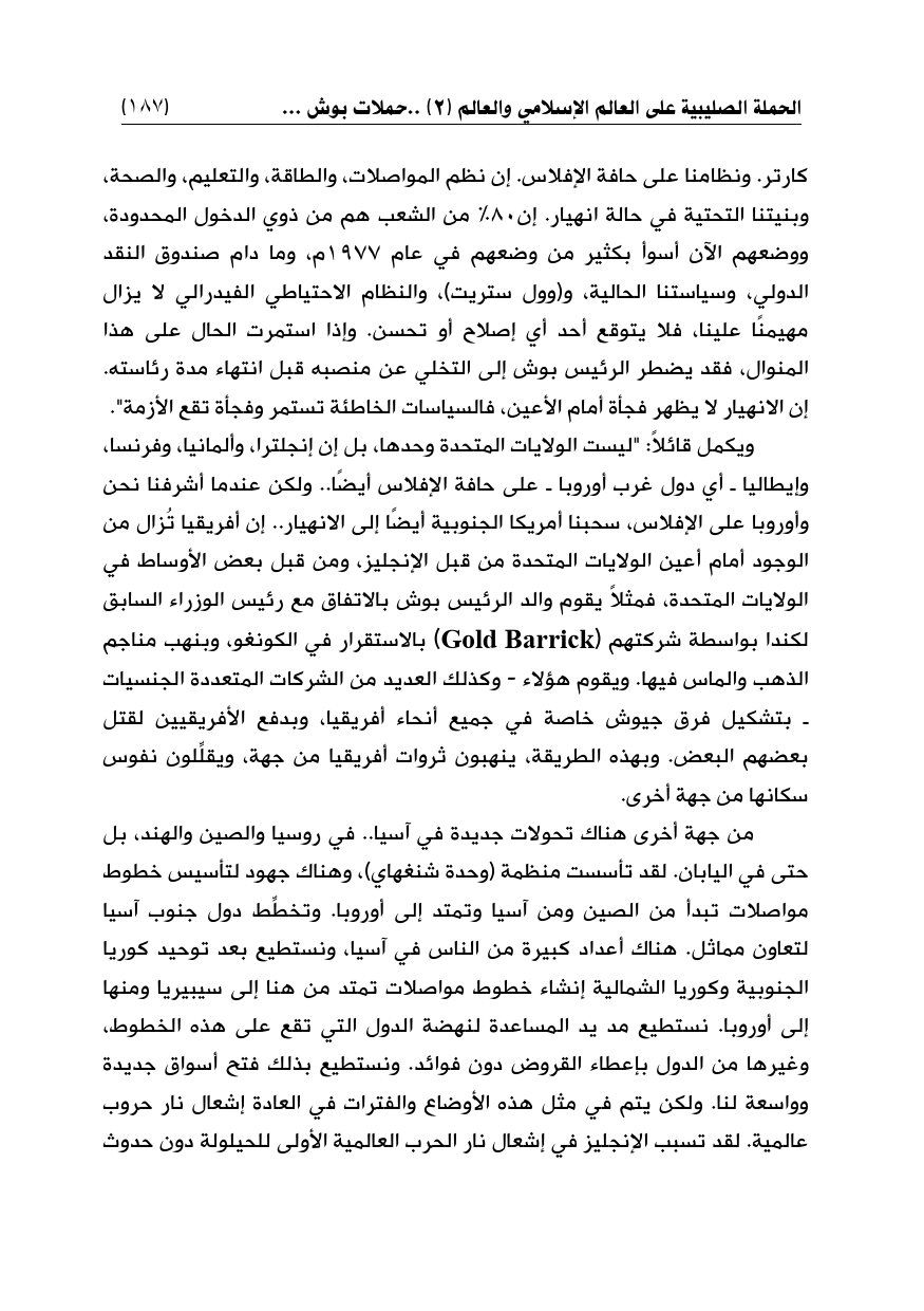 ويكمل قائلاً: "ليست الولايات المتحدة وحدها، بل إن إنجلترا، وألمانيا، وفرنسا، وإيطاليا ـ أي دول غرب أوروبا ـ على حافة الإفلاس أيضًا .. ولكن عندما أشرفنا نحن وأوروبا على الإفلاس، سحبنا أمريكا الجنوبية أيضًا إلى الانهيار .. إن أفريقيا تُزال من الوجود أمام أعين الولايات المتحدة من قبل الإنجليز، ومن قبل بعض الأوساط في الولايات المتحدة، فمثلاً يقوم والد الرئيس بوش بالاتفاق مع رئيس الوزراء السابق لكندا بواسطة شركتهم ( Barrick Gold) بالاستقرار في الكونغو، وبنهب مناجم الذهب والماس فيها. ويقوم هؤلاء - وكذلك العديد من الشركات المتعددة الجنسيات ـ بتشكيل فرق جيوش خاصة في جميع أنحاء أفريقيا، وبدفع الأفريقيين لقتل بعضهم البعض. وبهذه الطريقة، ينهبون ثروات أفريقيا من جهة، ويقلِّلون نفوس سكانها من جهة أخرى.