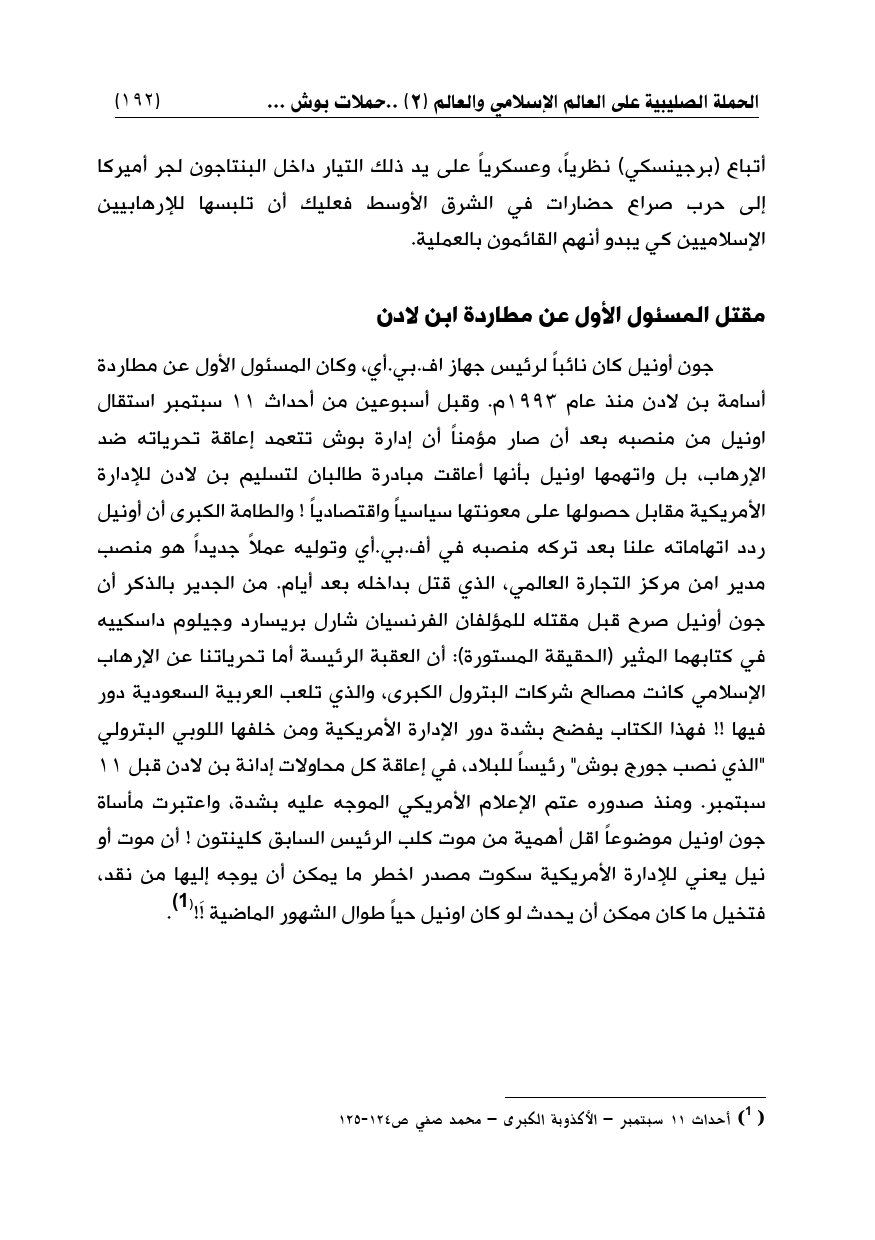 جون أونيل كان نائباً لرئيس جهاز اف. بي. أي، وكان المسئول الأول عن مطاردة أسامة بن لادن منذ عام 1993م. وقبل أسبوعين من أحداث 11 سبتمبر استقال اونيل من منصبه بعد أن صار مؤمناً أن إدارة بوش تتعمد إعاقة تحرياته ضد الإرهاب، بل واتهمها اونيل بأنها أعاقت مبادرة طالبان لتسليم بن لادن للإدارة الأمريكية مقابل حصولها على معونتها سياسياً واقتصادياً! والطامة الكبرى أن أونيل ردد اتهاماته علنا بعد تركه منصبه في أف. بي. أي وتوليه عملاً جديداً هو منصب مدير امن مركز التجارة العالمي، الذي قتل بداخله بعد أيام. من الجدير بالذكر أن جون أونيل صرح قبل مقتله للمؤلفان الفرنسيان شارل بريسارد وجيلوم داسكييه في كتابهما المثير (الحقيقة المستورة): أن العقبة الرئيسة أما تحرياتنا عن الإرهاب الإسلامي كانت مصالح شركات البترول الكبرى، والذي تلعب العربية السعودية دور فيها!! فهذا الكتاب يفضح بشدة دور الإدارة الأمريكية ومن خلفها اللوبي البترولي "الذي نصب جورج بوش" رئيساً للبلاد، في إعاقة كل محاولات إدانة بن لادن قبل 11 سبتمبر. ومنذ صدوره عتم الإعلام الأمريكي الموجه عليه بشدة، واعتبرت مأساة جون اونيل موضوعاً اقل أهمية من موت كلب الرئيس السابق كلينتون! أن موت أو نيل يعني للإدارة الأمريكية سكوت مصدر اخطر ما يمكن أن يوجه إليها من نقد، فتخيل ما كان ممكن أن يحدث لو كان اونيل حياً طوال الشهور الماضية! َ! (¬1).