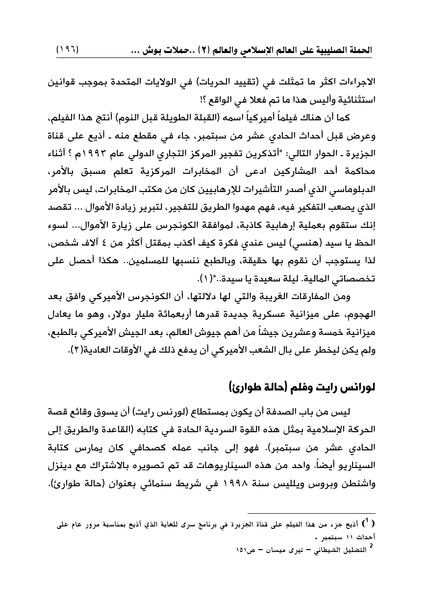 ومن المفارقات الغريبة والتي لها دلالتها، أن الكونجرس الأميركي وافق بعد الهجوم، على ميزانية عسكرية جديدة قدرها أربعمائة مليار دولار، وهو ما يعادل ميزانية خمسة وعشرين جيشاً من أهم جيوش العالم، بعد الجيش الأميركي بالطبع، ولم يكن ليخطر على بال الشعب الأميركي أن يدفع ذلك في الأوقات العادية (¬2).