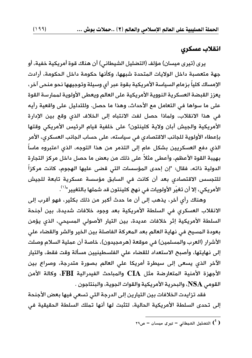 يرى (تيرى ميسان) مؤلف (التضليل الشيطاني) أن هناك قوة أمريكية خفية، أو جهة متعصبة داخل الولايات المتحدة شبهها، وكأنها حكومة داخل الحكومة، أرادت الإمساك كلياً بزمام السياسة الأمريكية بقوة عبر أي وسيلة وتوجيهها نحو منحى آخر، يعزز القبضة العسكرية النووية الأمريكية على العالم ويعطى الأولوية لممارسة القوة على ما سواها في التعامل مع الأحداث، وهذا ما حصل. وللتدليل على واقعية رأيه في هذا الانقلاب، ولماذا حصل لفت الانتباه إلى الخلاف الذي وقع بين الإدارة الأمريكية والجيش أبان ولاية كلينتون؟ على خلفية قيام الرئيس الأمريكي وقتها بإعطاء الأولوية للجانب الاقتصادي في سياسته، على حساب الجانب العسكري، الأمر الذي دفع العسكريين بشكل عام إلى التذمر من هذا التوجه، الذي اعتبروه ماساً بهيبة القوة الأعظم، وأعطى مثلاً على ذلك من بعض ما حصل داخل مركز التجارة الدولية ذاته، فقال: "إن إحدى المؤسسات التي قضى عليها الهجوم، كانت مركزاً للتجسس الاقتصادي بعد أن كانت في السابق مؤسسة عسكرية تابعة للجيش الأمريكي، إلا أن تغيّر الأولويات في نهج كلينتون قد شملها بالتغيير" (¬1).