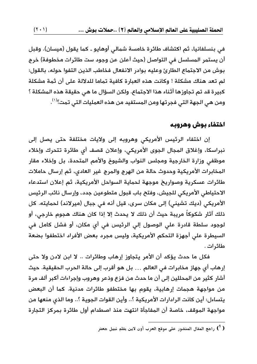 في بنسلفانيا، ثم اكتشاف طائرة خامسة شمالي أوهايو ـ كما يقول (ميسان). وقبل أن يستمر المسلسل في التواصل (حيث أعلن عن وجود ست طائرات مخطوفة) خرج بوش من الاجتماع الطارئ وعليه بوادر الانفعال فخاطب الذين التفوا حوله، بالقول: لم تعد هناك مشكلة! وكانت هذه العبارة كافية تماما للدلالة على أن ثمة مشكلة كبيرة قد تم تجاوزها أثناء هذا الاجتماع. ولكن السؤال ما هي حقيقة هذه المشكلة؟ ومن هي الجهة التي فجرتها ومن المستفيد من هذه العمليات التي تمت؟ (¬1).