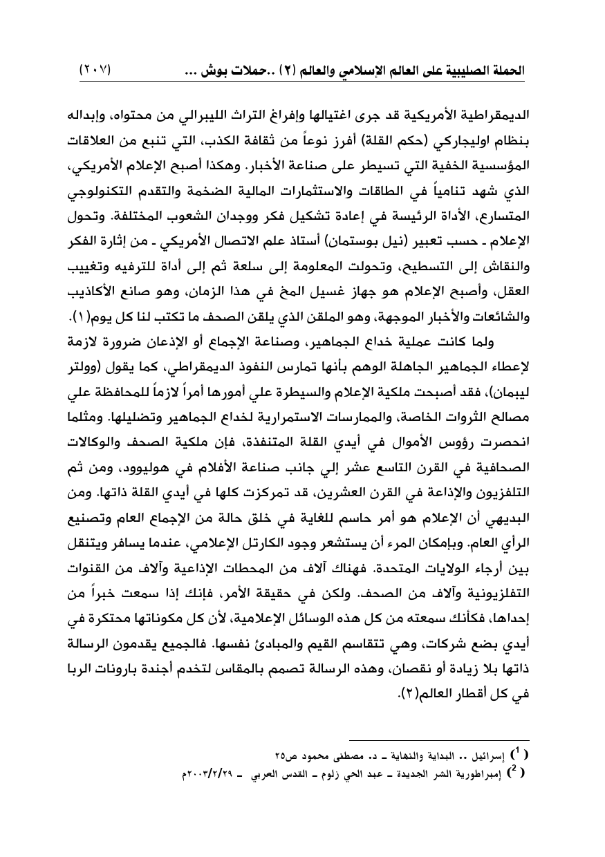 الديمقراطية الأمريكية قد جرى اغتيالها وإفراغ التراث الليبرالي من محتواه، وإبداله بنظام اوليجاركي (حكم القلة) أفرز نوعاً من ثقافة الكذب، التي تنبع من العلاقات المؤسسية الخفية التي تسيطر على صناعة الأخبار. وهكذا أصبح الإعلام الأمريكي، الذي شهد تنامياً في الطاقات والاستثمارات المالية الضخمة والتقدم التكنولوجي المتسارع، الأداة الرئيسة في إعادة تشكيل فكر ووجدان الشعوب المختلفة. وتحول الإعلام ـ حسب تعبير (نيل بوستمان) أستاذ علم الاتصال الأمريكي ـ من إثارة الفكر والنقاش إلى التسطيح، وتحولت المعلومة إلى سلعة ثم إلى أداة للترفيه وتغييب العقل، وأصبح الإعلام هو جهاز غسيل المخ في هذا الزمان، وهو صانع الأكاذيب والشائعات والأخبار الموجهة، وهو الملقن الذي يلقن الصحف ما تكتب لنا كل يوم (¬1).