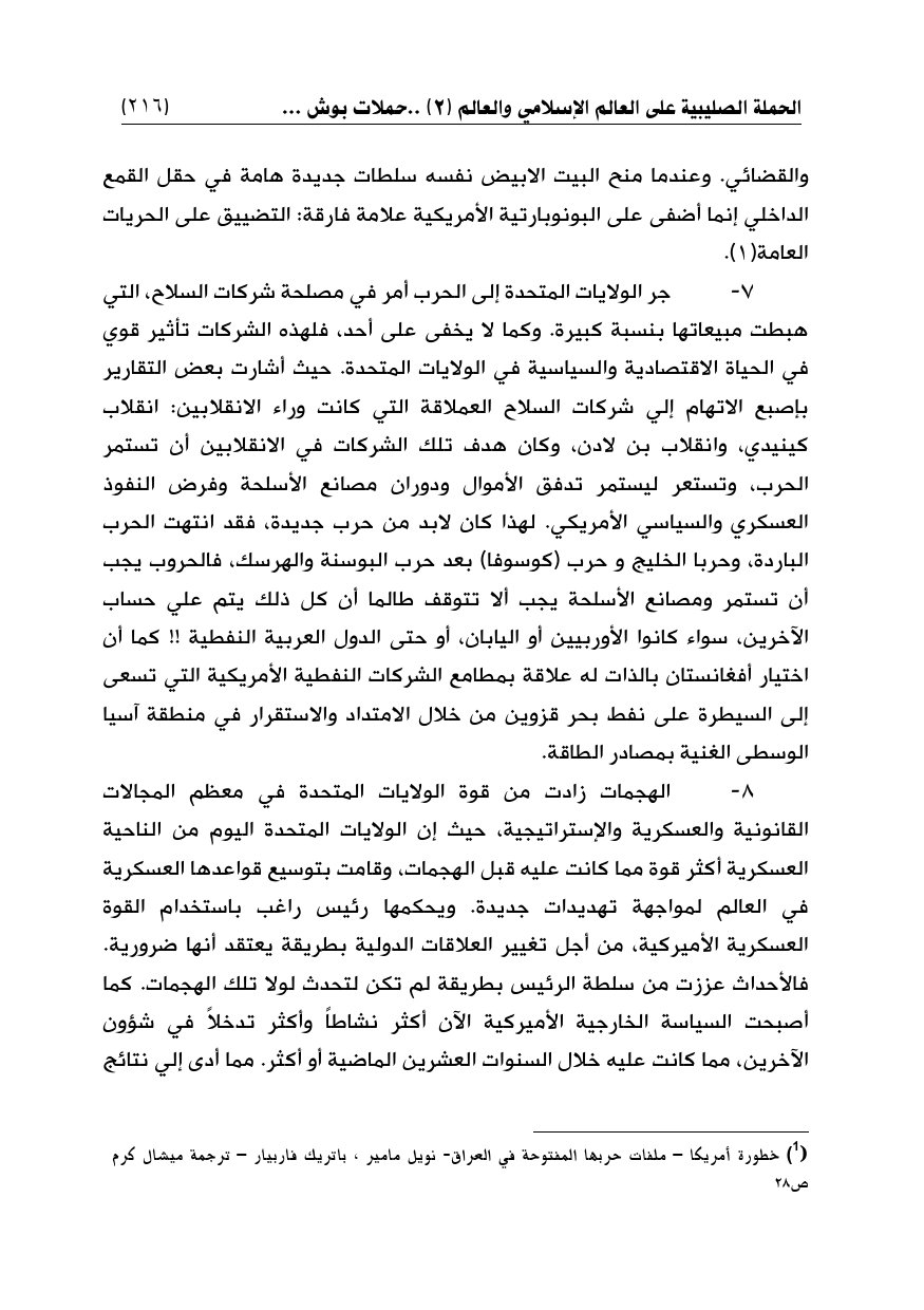 والقضائي. وعندما منح البيت الابيض نفسه سلطات جديدة هامة في حقل القمع الداخلي إنما أضفى على البونوبارتية الأمريكية علامة فارقة: التضييق على الحريات العامة (¬1).